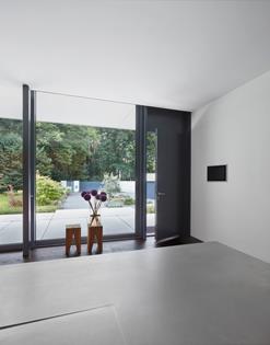 Schüco Schiebesysteme aus Aluminium bieten für Bauherren, die raumhohe und großzügig dimensionierte Schiebeanlagen mit schmalsten Profilansichten wünschen, vielfältige Lösungen in unterschiedlichen Bautiefen und Wärmedämmwerten. Für die leichte und komfortable Bedienung stehen je nach Konstruktion manuelle oder mechatronische Beschläge zur Verfügung, die Flügelgewichte bis zu 500 kg schnell und sicher bewegen. Verriegeln, schließen und öffnen lassen sich die mechatronischen Schiebetüren per Knopfdruck über ein Bedienboard am Flügel oder einen Raumtaster. Eine Öffnungs- und Verschlussüberwachung mit Rückmeldefunktion hilft beim Verlassen des Hauses, die Schiebeelemente zu kontrollieren. Das Überwachungssystem lässt sich in Gebäudeautomationssysteme einbinden und mit Einbruchmeldeanlagen kombinieren. (Abb. 14, 15, 16, 17)