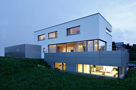 Schüco Aluminium-Fenster stehen für vielfältige Ausstattungsoptionen. Mit hohen Wärmedämmwerten bis Passivhausstandard und ihrer exzellenten Stabilität eignen sie sich besonders zur Aufnahme von großen Glasformaten. Mit dem profilintegrierten und damit verdeckt liegenden Beschlag Schüco AvanTec SimplySmart ist Einbruchhemmung bis Widerstandsklasse RC 3 möglich. Ein weiterer Zusatznutzen dieses Beschlages ist der 180° Öffnungswinkel. Für Bauherren mit hohem Komfortanspruch ist der verdeckt liegende mechatronische Beschlag Schüco TipTronic SimplySmart eine geeignete Wahl. Neben einer manuellen Bedienung per Griff oder Raumtaster können auch mobile Endgeräte wie z. B. Tablets und Smartphones zum Öffnen und Verriegeln der Fenster genutzt werden. Durch modulare Sicherheitsverriegelungen ist mit diesem Beschlag Einbruchhemmung bis RC 2 erreichbar. Eine optional erhältliche automatische Statusüberwachung der Fenster hilft dem Bauherren beim Verlassen des Gebäudes zu prüfen, ob alle Fenster geschlossen sind. Das Überwachungssystem lässt sich darüber hinaus in Einbruchmeldeanlagen und beliebige Gebäudeautomationssysteme einbinden. (Abb. 09, 10, 11, 12)