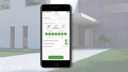 In Kombination mit Motorschlössern lassen sich Schüco Sicherheits-Haustüren aus Aluminium schlüssellos auch mit dem eigenen Smartphone öffnen. Über die Schüco BlueCon App (Android oder iOS) kann die Tür, je nach Einstellung, automatisch oder manuell geöffnet werden. Die „Auto unlock“-Funktion ermöglicht ein automatisches Entriegeln und Öffnen der Tür, sobald die Bluetooth-Verbindung zwischen Zutrittskontrollmodul und Smartphone besteht. Alternativ kann die Tür manuell geöffnet werden – per Auswahl in der App oder mit der „Swipe to unlock“-Funktion als Push-Benachrichtigung. (Abb. 24, 25)