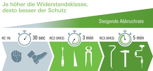 Einbruchhemmende Elemente werden nach der europäischen Norm DIN EN 1627 in sechs Widerstandsklassen „RC“ (Resistance Class) eingeteilt. Dabei gilt: Je höher die Widerstandklasse, desto besser ist der Einbruchschutz. Während die höheren Klassen RC 4 bis RC 6 insbesondere im gewerblichen Bereich zum Einsatz kommen, finden die Klassen RC 1 N bis RC 3 meist auch im privaten Wohnungsbau Anwendung. (Abb. 03)