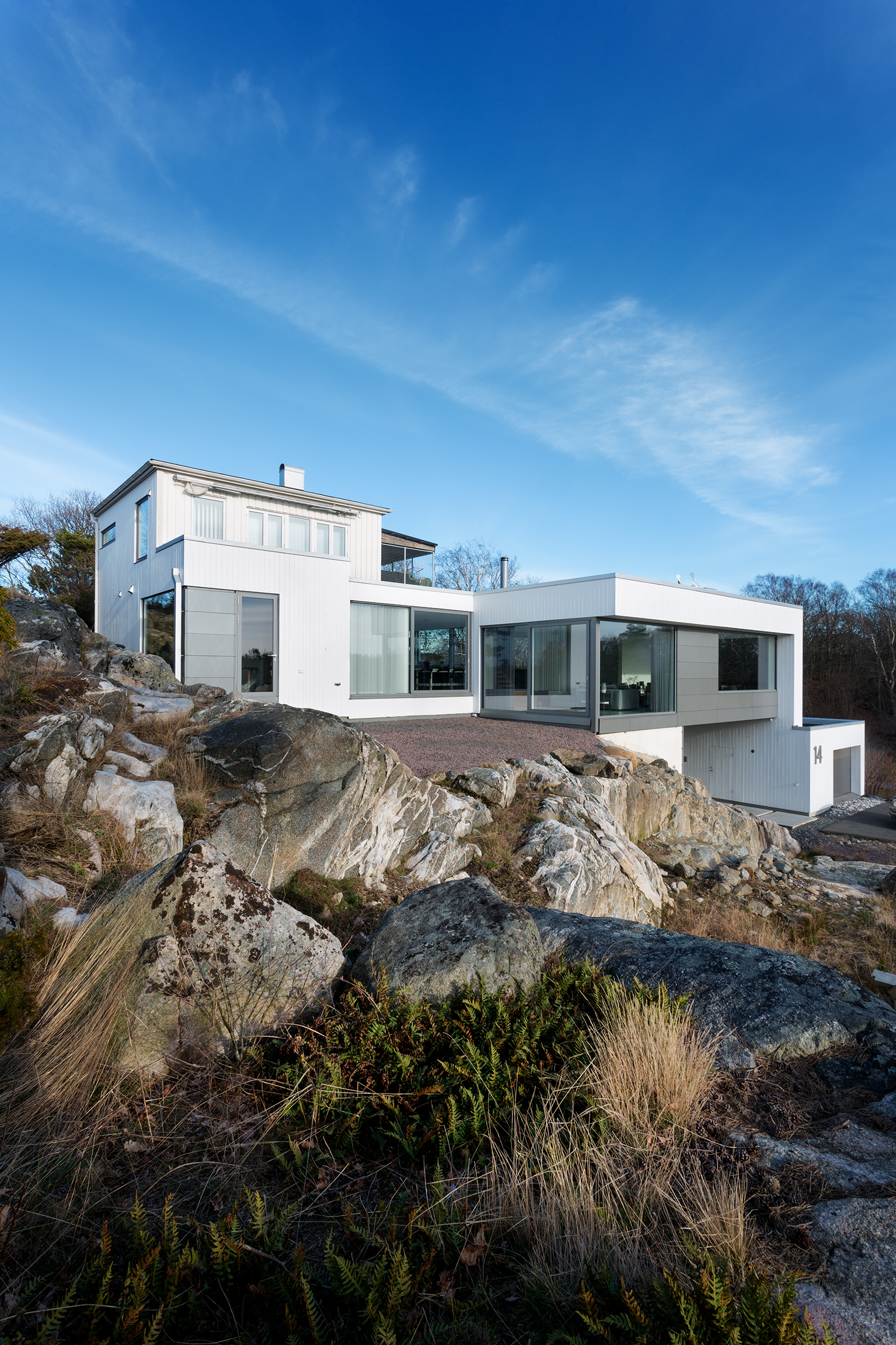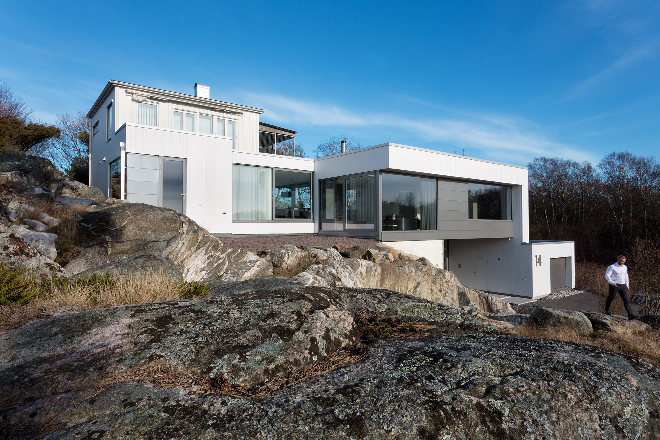 Das dreigeschossige Renovationsobjekt liegt im schwedischen Ort Särö, rund 25 km südlich von Göteborg. Beim Erwerb durch die jungen Bauherren befand sich das Gebäude weitgehend in seinem originalen Zustand aus dem Jahre 1969. Die Eigner entschieden sich für eine umfangreiche Renovation und Erweiterung in drei Bauschritten, bei der lediglich die Grundstrukturen aus Beton erhalten bleiben sollten. Sie begannen mit den konstruktiv und bautechnisch weniger anspruchsvollen Gebäudeteilen. So wurde zunächst das 65 m² große Erdgeschoss mit Eingangsbereich, Garage, Waschraum und Vorratsraum renoviert, im Anschluss dann das 35 m² große Obergeschoss. Die größte Herausforderung stellte schließlich der Umbau des 170 m² großen mittleren Geschosses dar. Dieser Gebäudebereich sollte später sämtliche wichtigen Wohn- und Funktionsbereiche des alltäglichen Lebens integrieren – darunter großzügige, offene Wohn-, Ess- und Kochbereiche sowie Terrassenzugänge. Darüber hinaus sollte diese Gebäudeebene auch architektonisch prägend sein für die moderne, Bauhaus inspirierte Außenansicht und Wohnqualität des Gebäudes.