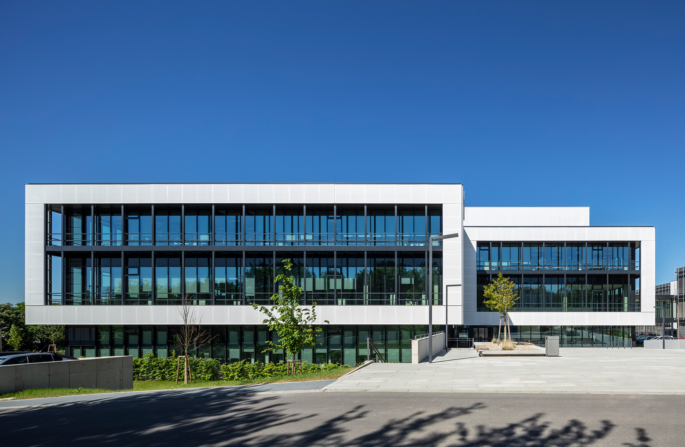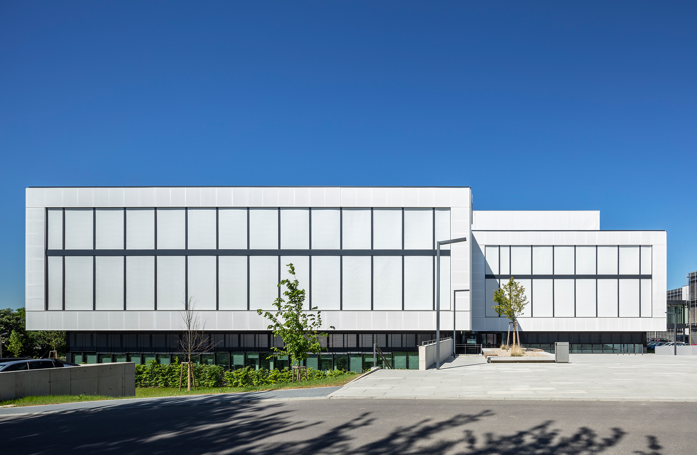Ein charakteristisches Element der Außenansicht sind die oberhalb des Erdgeschosses und an den Außenkanten der Fassaden weit vorkragenden Textilelemente, die die Glasflächen und die davor montierten schwarzen Stahlbalkone als weiße Rahmen einfassen: „Die ungewöhnliche Lösung betont den modernen Charakter des Entwurfes und schließt dabei optisch an die Architektur des Nachbargebäudes mit seinen großen Glasfassaden und den teilweise umgebenden weiß verputzten Flächen an“, erklärt Wolfgang Eitel, Partner und Geschäftsführer bei Vollack archiTec. „Komplettiert wird die Ansicht durch einen optisch angepassten und flächenbündig mit der Textilfassade ausgebildeten außen liegenden Sonnenschutz aus perforiertem Kunststoffgewebe, der einen flexiblen Sicht- und Sonnenschutz für die Mitarbeiter ermöglicht.“