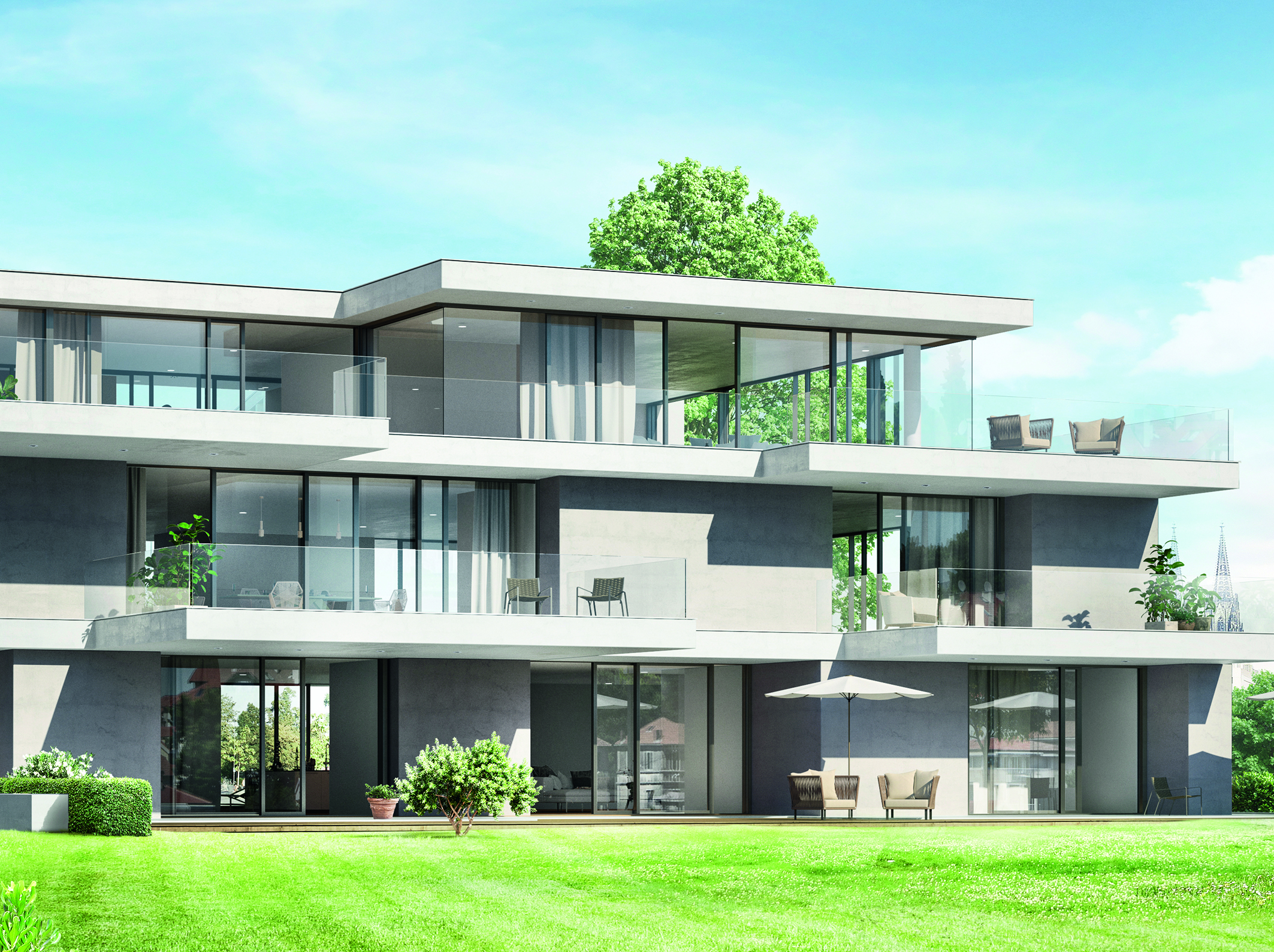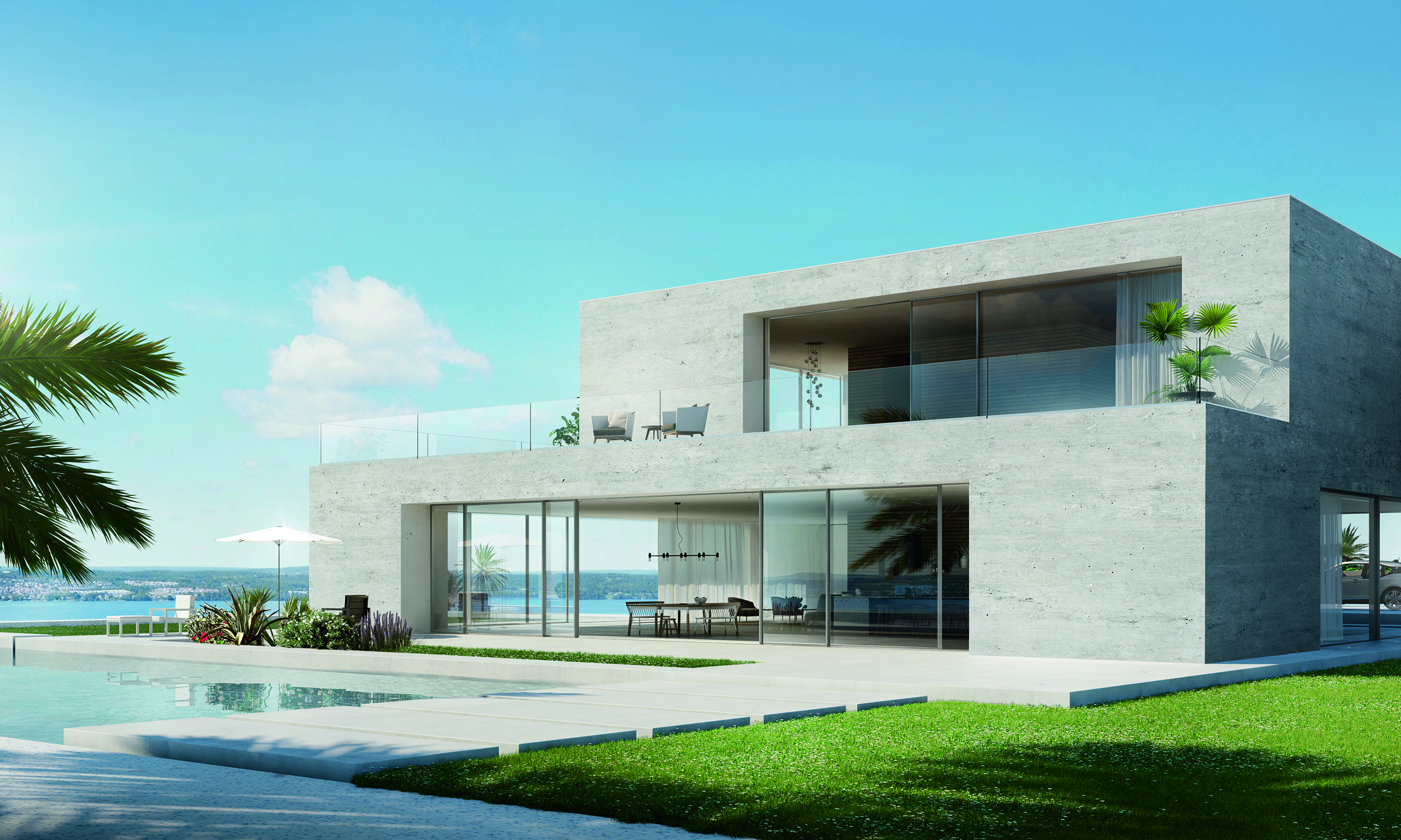 Die mit dem Red Dot Product Design Award 2019 ausgezeichneten Schüco Fenster-, Schiebe-, und Fassadensysteme überzeugen durch eine klare Architekturansprache in hochwertigem Panorama Design.