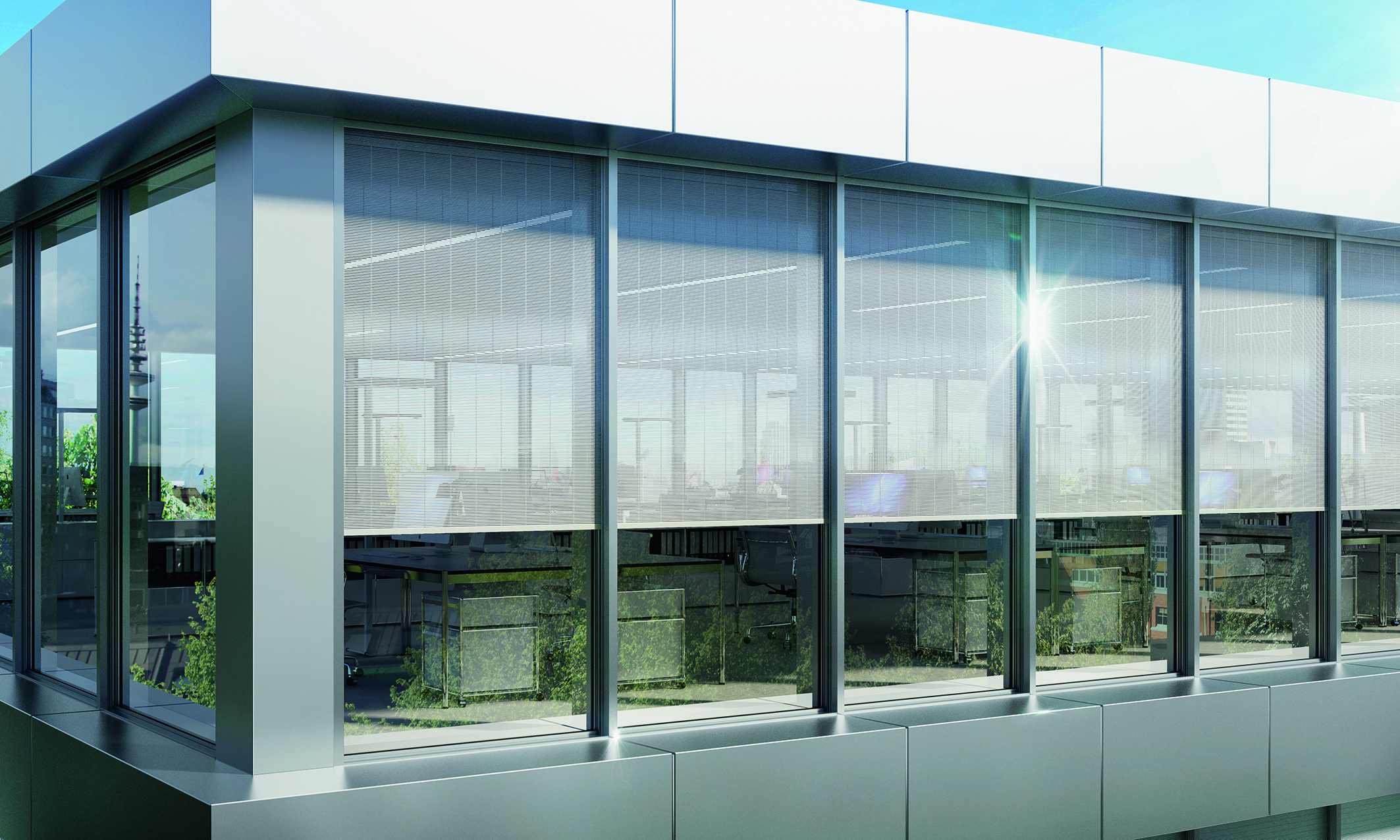 Der außen liegende, rollbare Sonnenschutz Schüco CSB (Concealed Shaped Blind) aus Aluminiumlamellen bietet eine effektive Verschattungslösung – zuverlässig auch bei Windstärke 9 - 10. Durch eine Transparenz von über 23 Prozent bleibt der Bezug zur Außenwelt selbst bei vollständig heruntergefahrenem Behang erhalten. In unterschiedlichen Eloxaltönen kann sich der Sonnenschutz optimal in das äußere Design eines Gebäudes einfügen oder farbliche Akzente setzen.