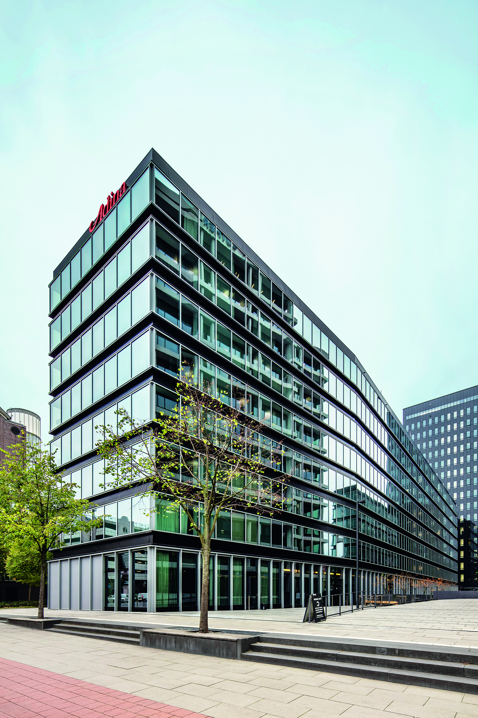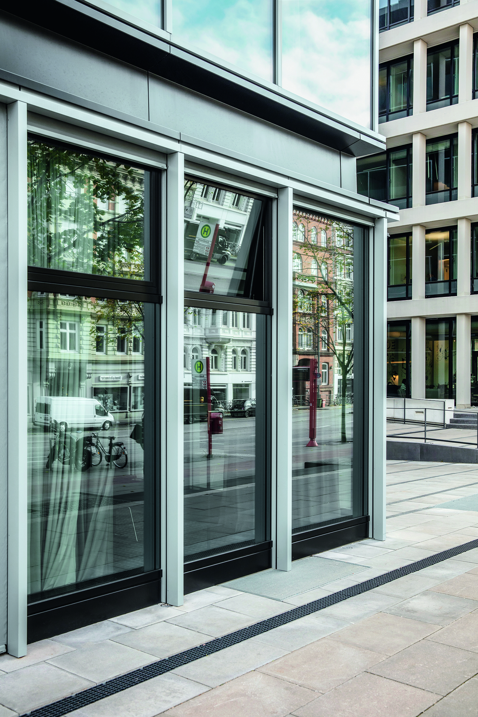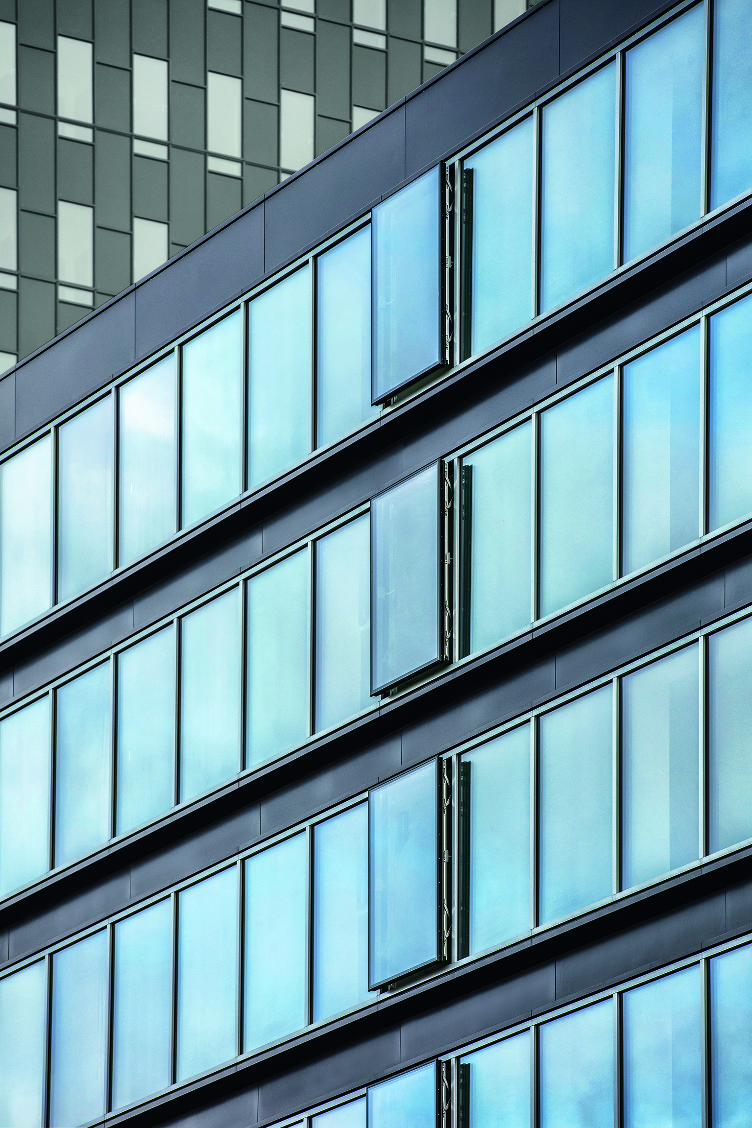 Um einen schnellen und kostengünstigen Baufortschritt zu ermöglichen, wurde das System von teilelementierten, in eine Stahlzarge eingearbeiteten Fensterbändern mit zwei, drei, vier oder fünf Achsen ausgeführt: „Ausgehend von einem Achsmaß von 1.300 x 2.200 Millimeter ergaben sich somit Elemente mit einer Baulänge von bis zu 6.500 Millimeter“, berichtet Norbert Heesen, Geschäftsführer der Heidersberger Fassadenbau GmbH aus Greven, die zuvor bereits an der Sanierung des Spiegel-Hochhauses beteiligt war und die gegenwärtig auch die beiden anderen beiden Neubauten umsetzt. „Auf der Baustelle wurden die bis zu 1.000 Kilogramm schweren Elemente mit Hilfe eines Krans auf eine am Baukörper befestigte, dreidimensional ausrichtbare Unterkonstruktion aus Stahl eingehangen.“ Je nach gewünschter Transparenz und Möglichkeit zur Belüftung kamen dabei Elemente mit opaken und transparenten Festfeldern sowie mit entsprechenden Kippflügeln zum Einsatz. Sämtliche Elemente wurden mit einer 3-fach-Verglasung ausgeführt, lediglich bei den Flügeln wurden spezielle Sonderprofile für eine 2-fach-Verglasung integriert, um eine optimale Bedienbarkeit der Flügel zu erreichen. In Teilbereichen wurde für eine optimierte natürliche Belüftung das Parallel-Ausstellfenster Schüco AWS 114 verbaut, das sich optisch nahtlos in die vorhandene Fassadenoptik einfügt.