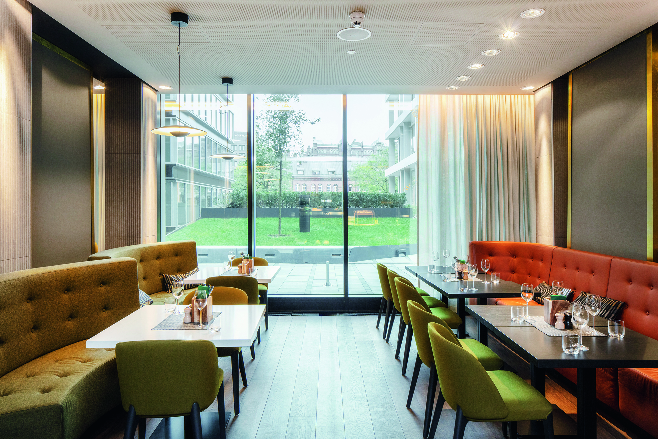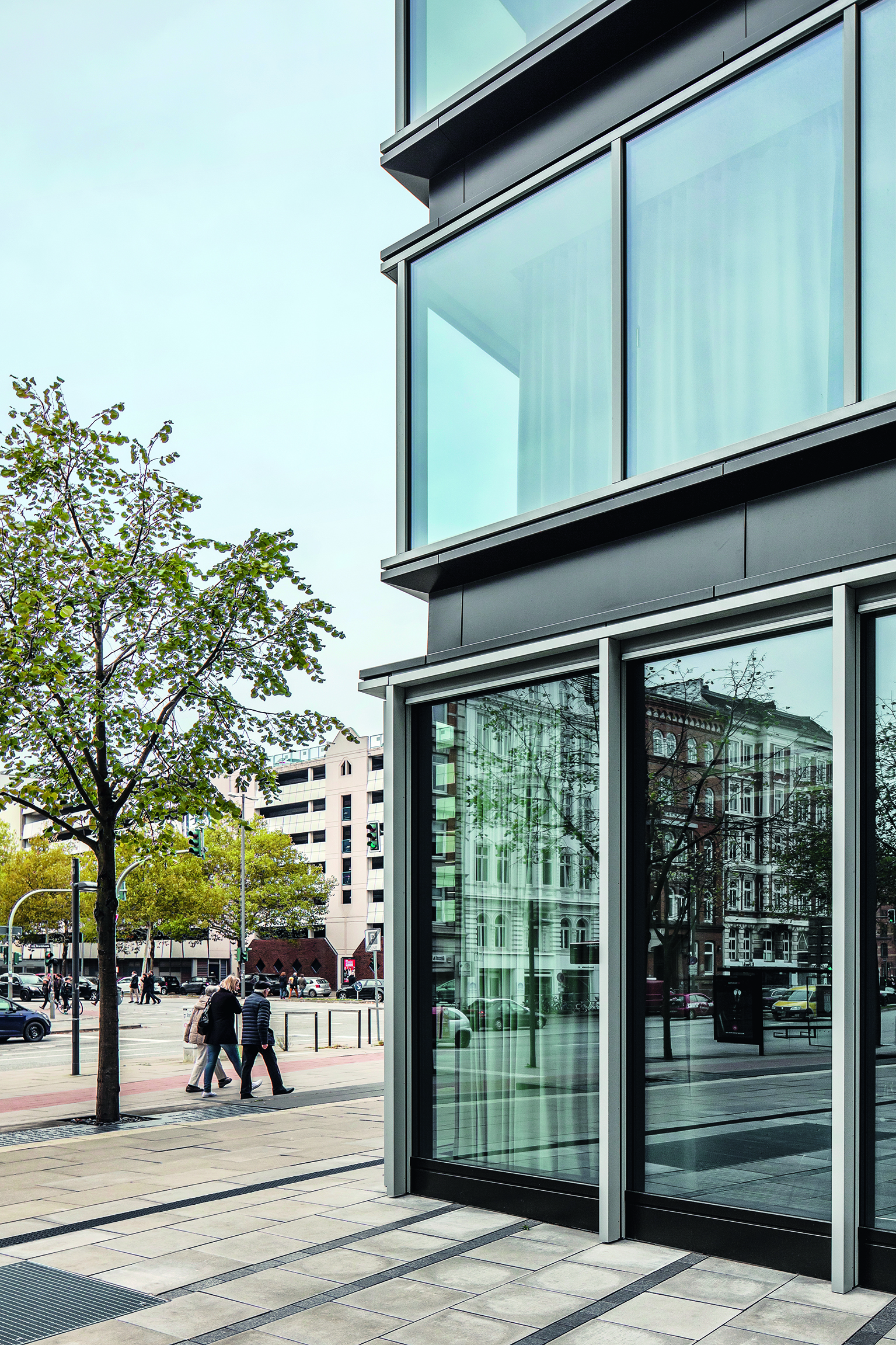 Eine abweichende Gestaltung zeigt das erhöhte Sockelgeschoss des Hotelbaus. Hier wurde die Pfosten-Riegelkonstruktion FWS 60.HI mit 1.300 x 3.400 Millimeter großen, dreifach verglasten Elementen umgesetzt. Als Fenster wurden Einsatzelemente aus der Serie AWS 90.SI+ integriert, daneben wurden ein- sowie zweiflügelige Türen aus der Serie ADS 90.SI verwendet. Eine Besonderheit sind die im Kopfpunkt der Konstruktion verdeckt eingebauten ZIP-Markisen, die eine windfeste Führung im innovativen Reißverschlussverfahren ermöglichen. Trotz hochwertiger Technik wurde so ein homogenes Fassadenbild ohne störende Details erreicht, das sich nahtlos in die Gesamtarchitektur des Standortes einfügt.