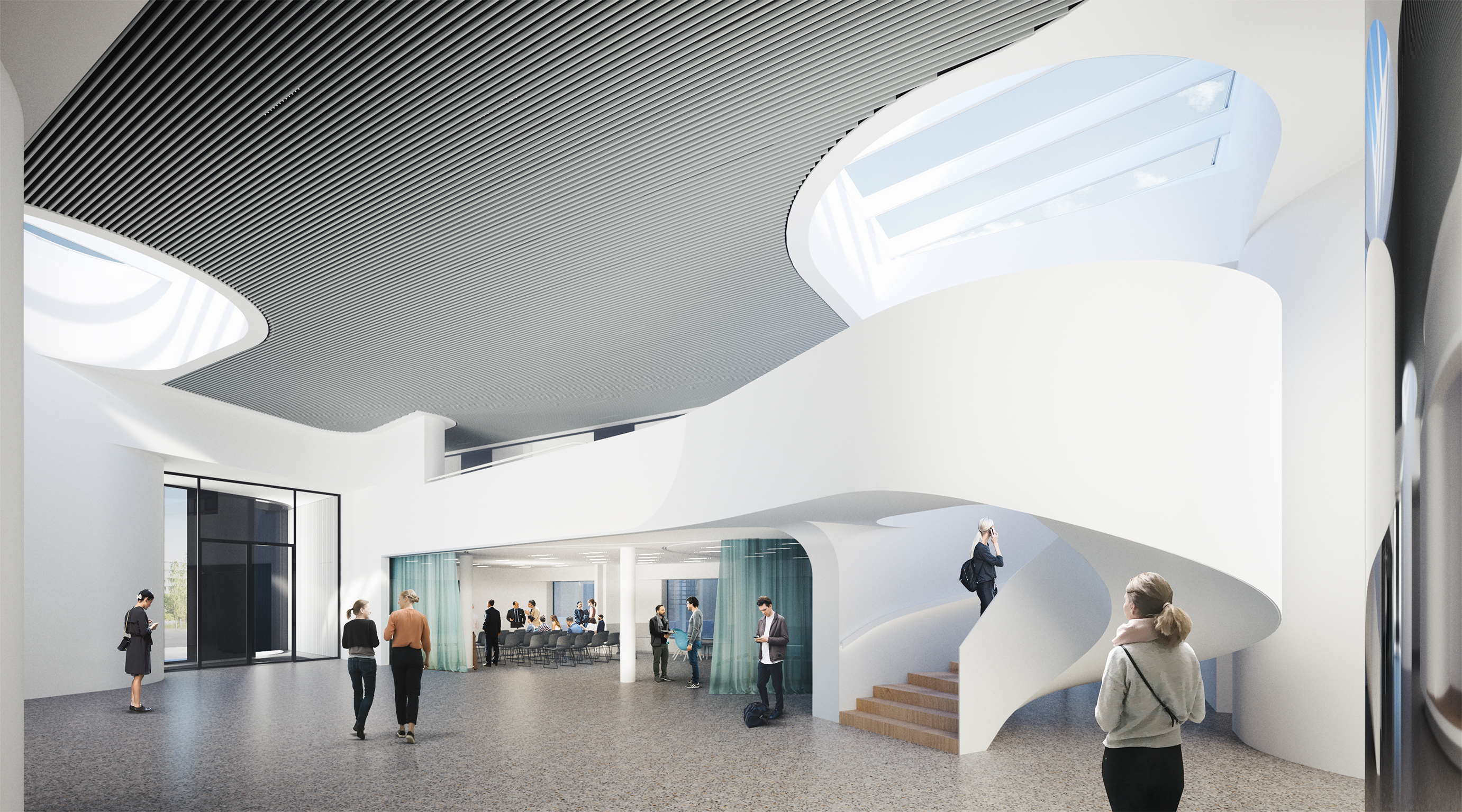 Der Entwurf des Architekturbüros one fine day rückt den Gast in den Mittelpunkt und schafft eine Einheit zwischen Innen- und Außenbereich. Ein zentrales Foyer verbindet alle Bereich des Welcome Forums miteinander und bietet den Besuchern ein 360°-Blick auf die gesamte Schüco Welt. Große Fensterfassade und runde Oberlichter öffnen das Gebäude und lassen an zahlreichen Stellen gezielt Tageslicht einfallen. Die in Teilen organische Formensprache des Entwurfs wird im Inneren durch geschwungene Treppen und abgerundete Tresen unterstrichen und setzt sich auch im Außenbereich fort. Statt eines konventionellen Flachdachs mit Attika haben die Architekten einen abgerundeten, strukturierten Abschluss des Daches gewählt, der von einem leicht fallenden Plisseerock inspiriert ist. Im Halbkreis angeordnete Sitzgelegenheiten und die abgerundete Plaza des Cafés unterstreichen die Formensprache im Außenbereich. Nachhaltige Grünflächen in, um und auf dem Besucherzentrum unterstützen den offenen und einladenden Charakter des Gebäudes und sind ein weiteres Puzzleteil der natürlichen und renaturierten Gesamtgestaltung des Schüco Campus.