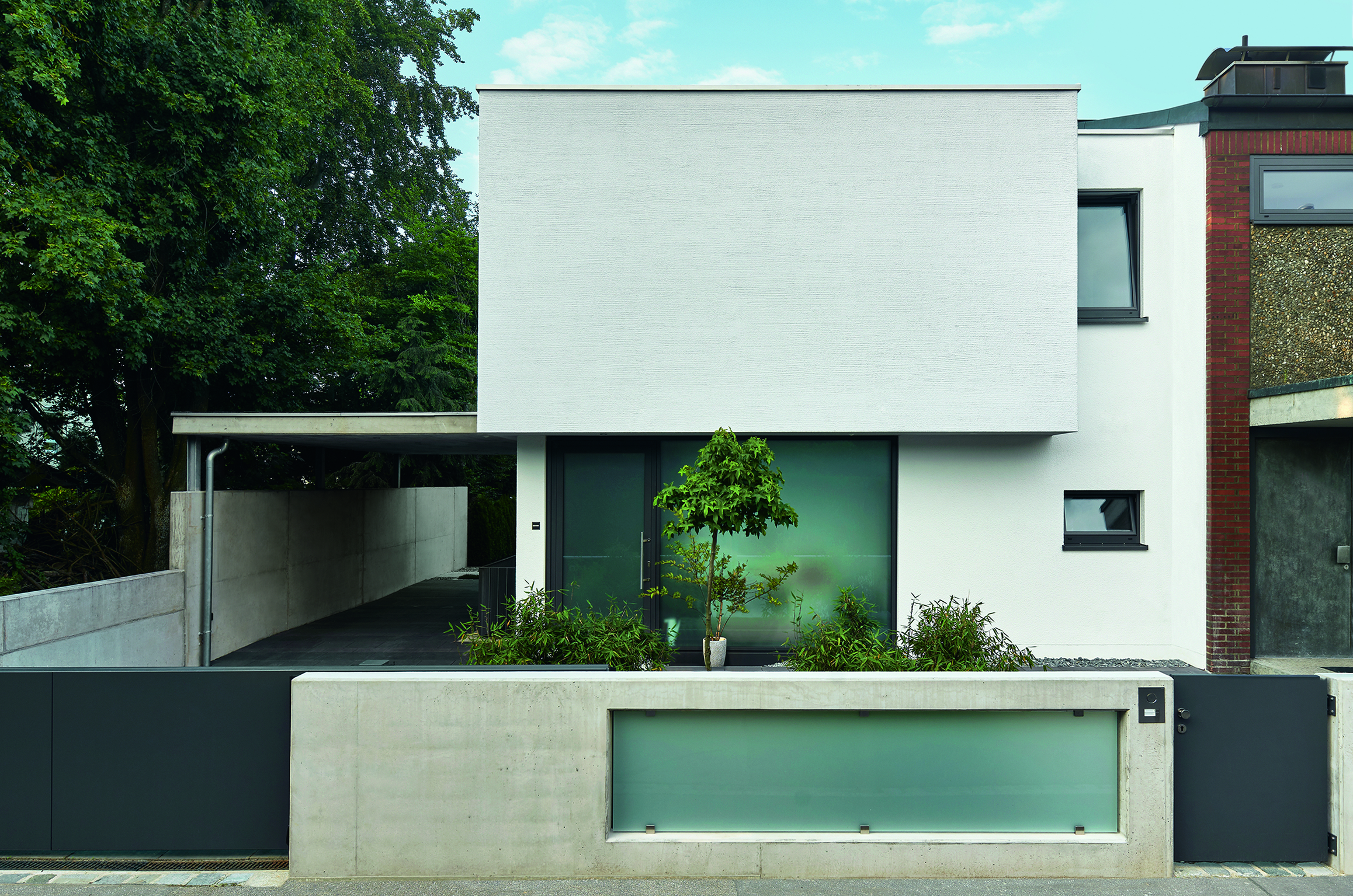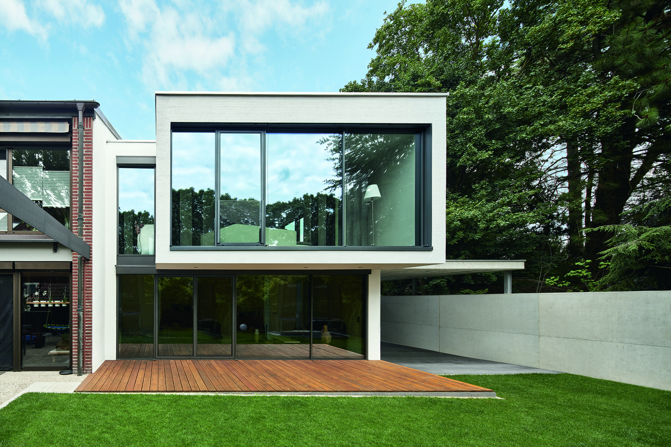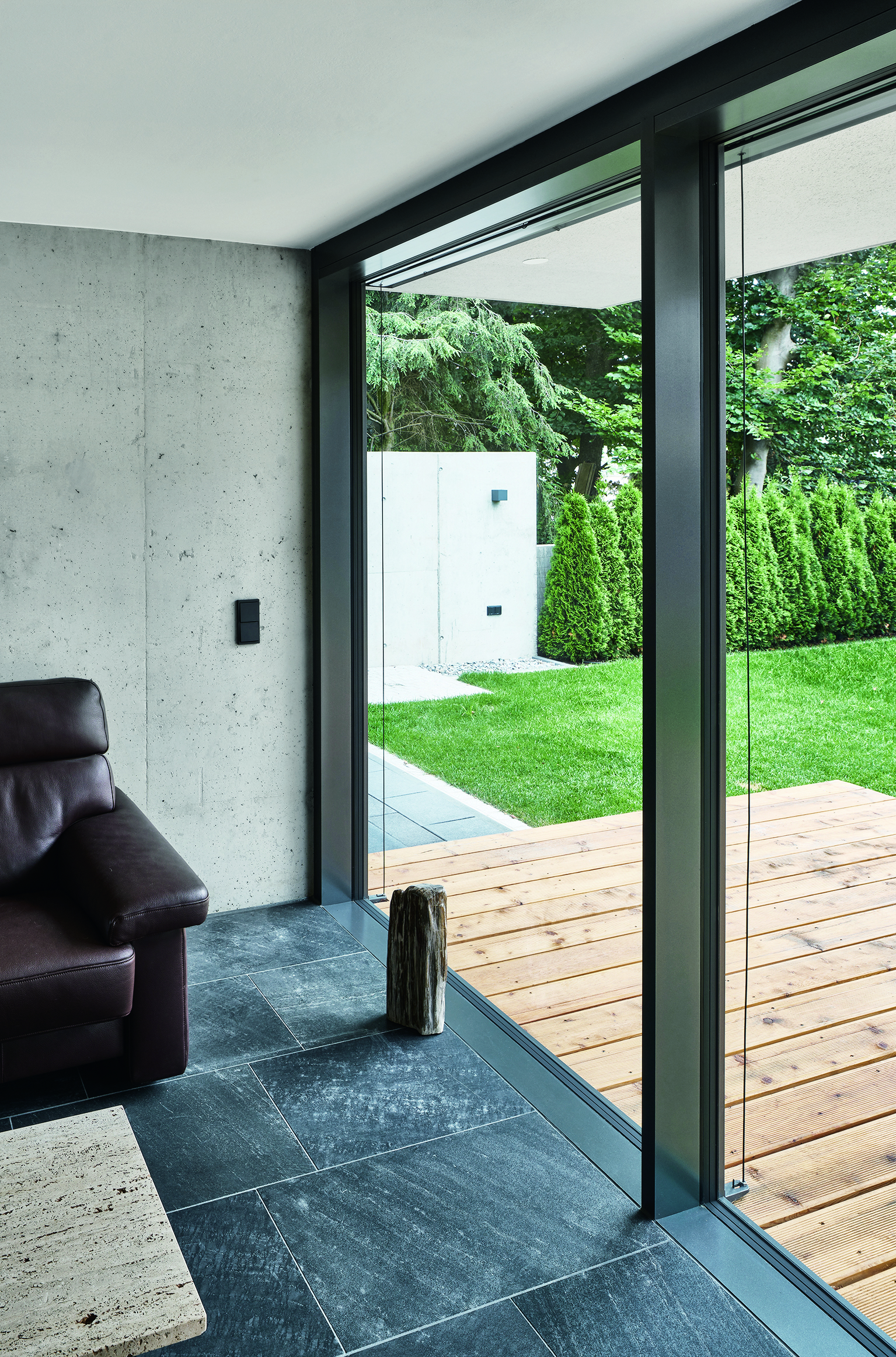 Klarheit, Transparenz und raumübergreifende Offenheit der Architektur folgen dabei einem zentralen Stilprinzip der Moderne - dem Diktum des "totalen Raums", der im Sinne von Mies van der Rohe einen möglichst nahtlosen Übergang zwischen Drinnen und Draußen schaffen soll. Bei der Umsetzung dieser stilistischen Zielsetzung spielen Fassaden und Systemelemente von Schüco eine zentrale Rolle. Vor allem an der Gartenfassade wird dies auf beiden Ebenen durch raumhohe, ungeteilte Fassadenelemente des Systems Schüco FWS 35 PD.SI sichtbar. Das spezielle "Panorama Design" dieses hoch isolierten Fassadesystems minimiert dabei die Ansichtsbreiten der Rahmenkonstruktion zugunsten eines Maximums an Transparenz. Der Effekt: Übergänge zwischen Wohn- und Naturraum werden auf beiden Geschossen optisch aufgelöst. Im Erdgeschoss wird dieser nahtlose Übergang sogar real, da die Grenzen zwischen Natur und Wohnraum durch die Integration eines großzügigen Öffnungselementes auf Wunsch ineinanderfließen.