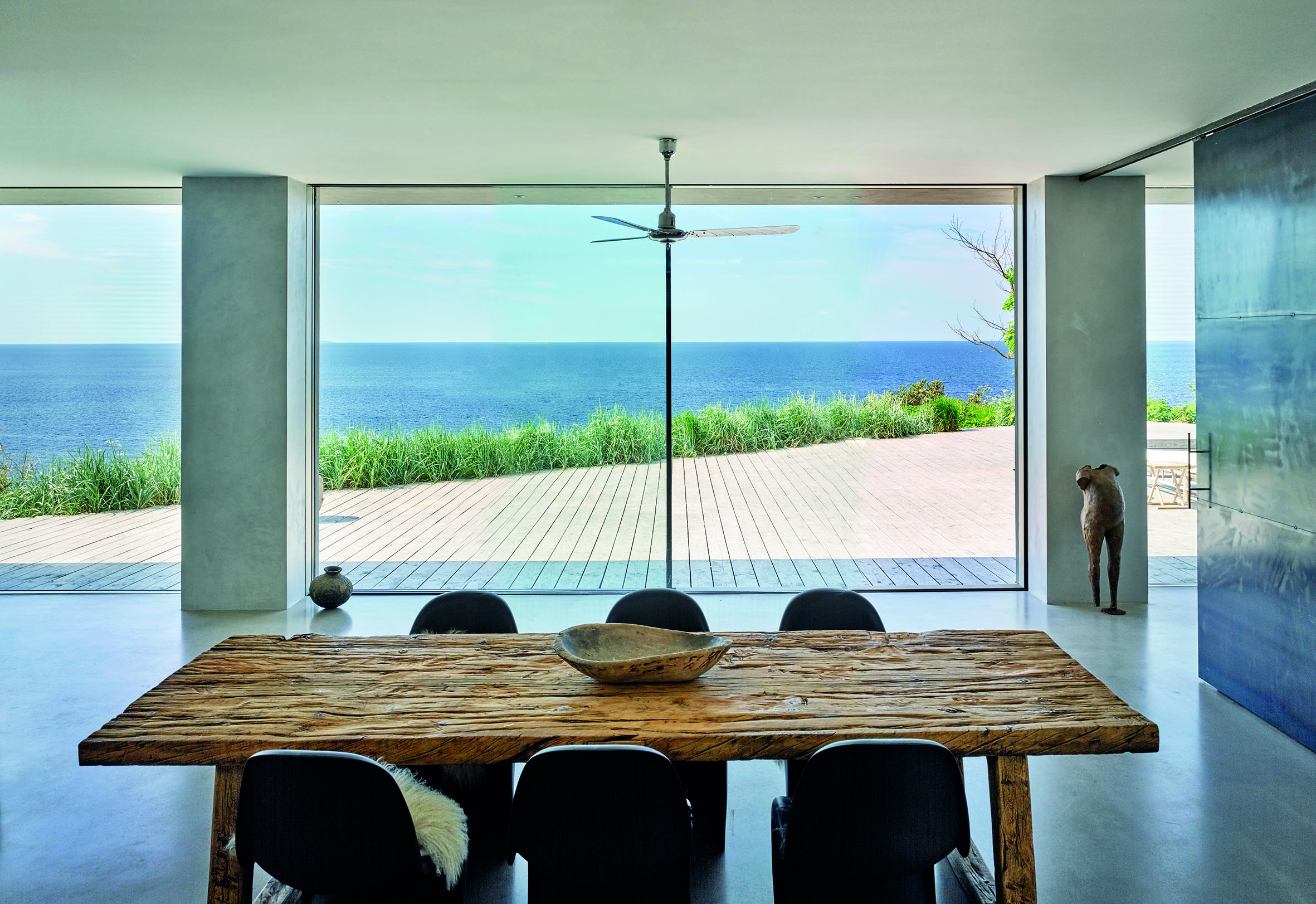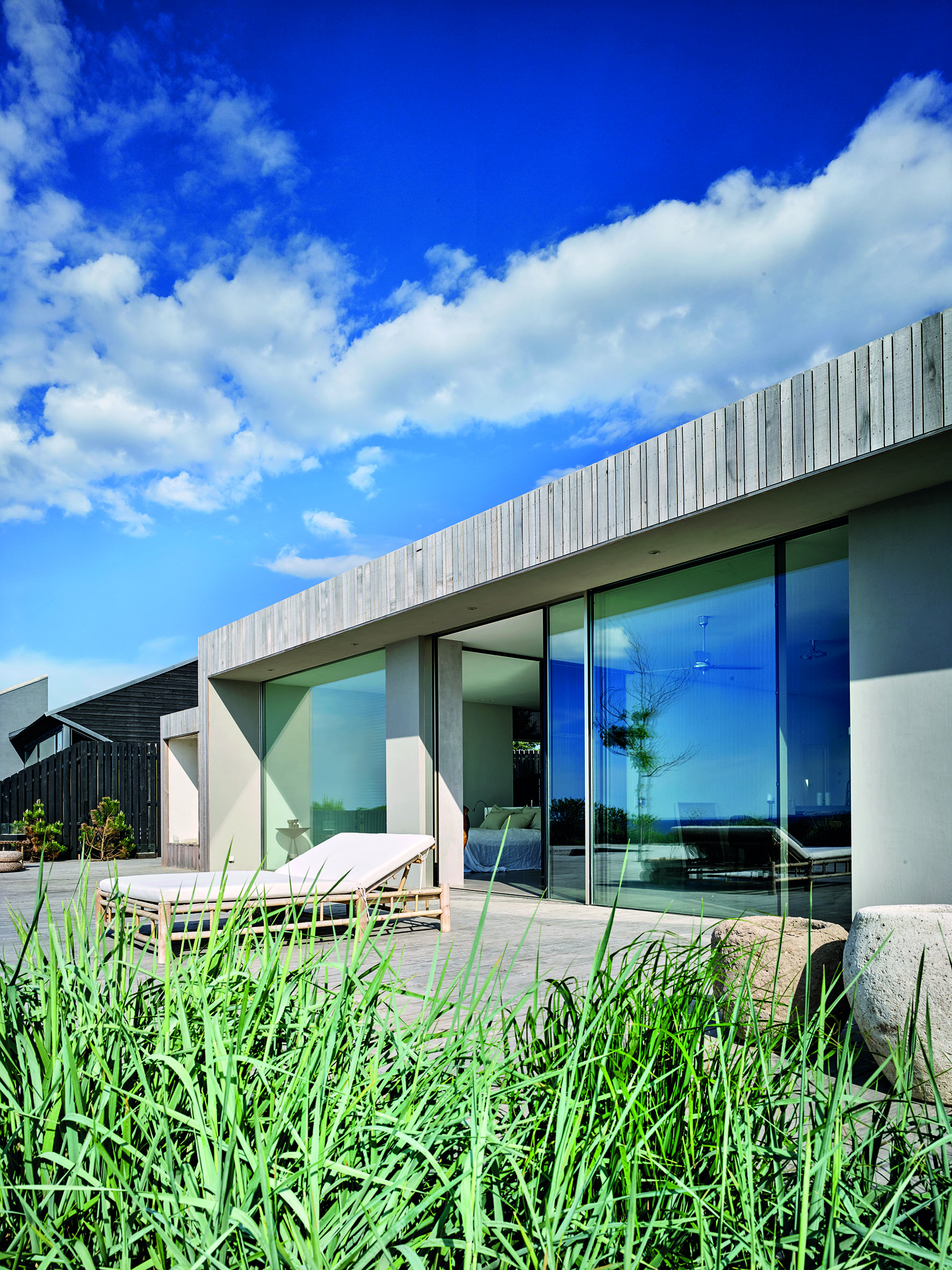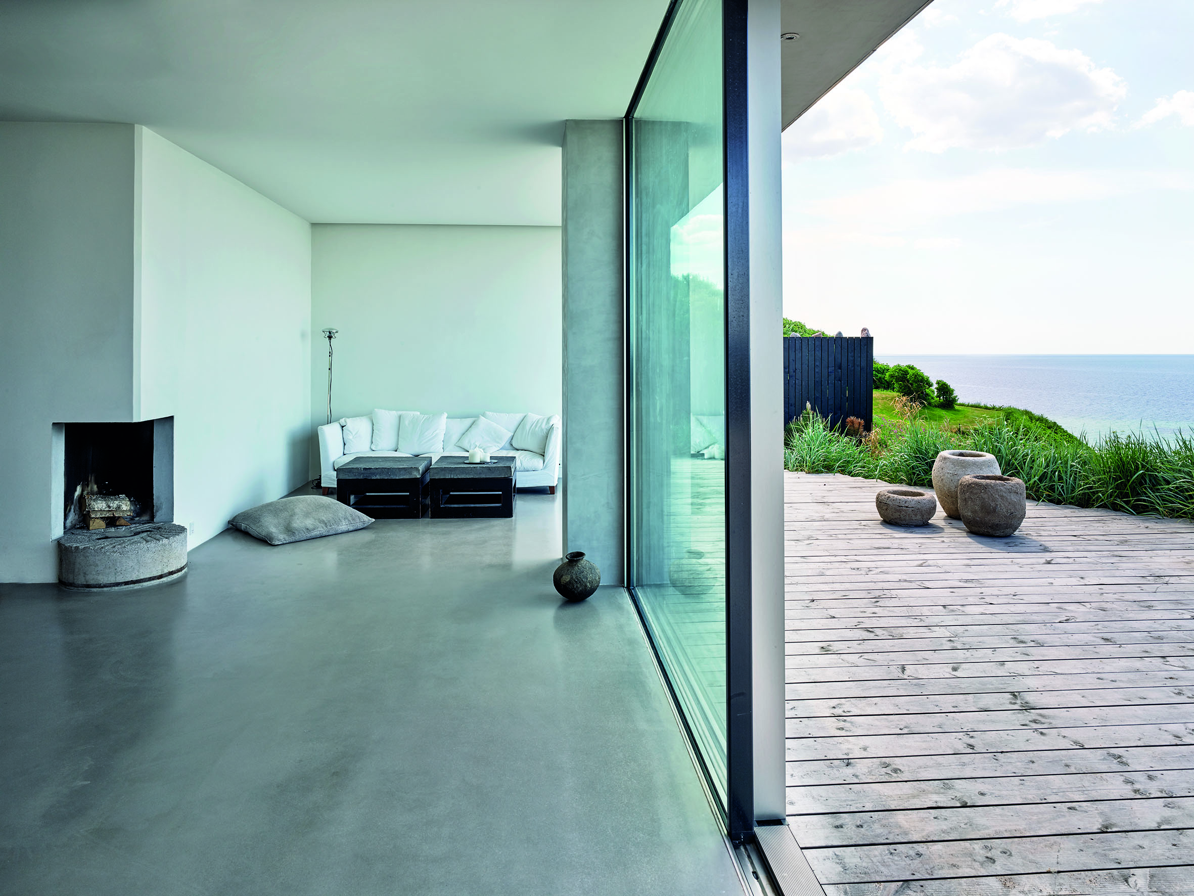 Birgitte Bruun wünschte sich für ihre Familie ein Ferienhaus, das in einem klaren Kontrast zu ihrem Hauptwohnsitz steht. Das Haus am Meer sollte ein Ort der Freizeit und der Ruhe sein, der die Außenwelt abschirmt und die Natur einlädt. Daher war der Blick auf das Wasser und dessen positive und beruhigende Wirkung der Bauherrin besonders wichtig. Auch in den kälteren Jahreszeiten wollte sie diesen Blick nicht missen und entschied sich für eine Lösung, die das Draußen mit dem Drinnen verbindet. Das Schüco Schiebesystem ASS 77 PD.SI ermöglicht der Familie eine einzigartige Aussicht. Das Panorama Design des Schüco Schiebesystems ASS 77 PD.SI zeichnet sich durch minimale Profilansichten im Verhakungsbereich und einen im Bauanschluss verdeckt liegenden Blendrahmen und Flügelrahmen aus. Zusätzlichen Komfort bietet das profilintegrierte elektronische Antriebs- und Verriegelungssystem. Besonders wichtig war der Bauherrin zudem der ebenmäßige Übergang zwischen Wohnraum und Terrasse, dem „Lieblingszimmer“ der Familie. Dieser Wunsch konnte mit einer Nullniveau-Schwelle realisiert werden. Zusammen mit dem Schüco Fassadensystem FWS 50.SI entstand so ein lichtdurchflutetes Ferienhaus mit großen Fensterfronten und einem umfassenden Blick aufs Meer.