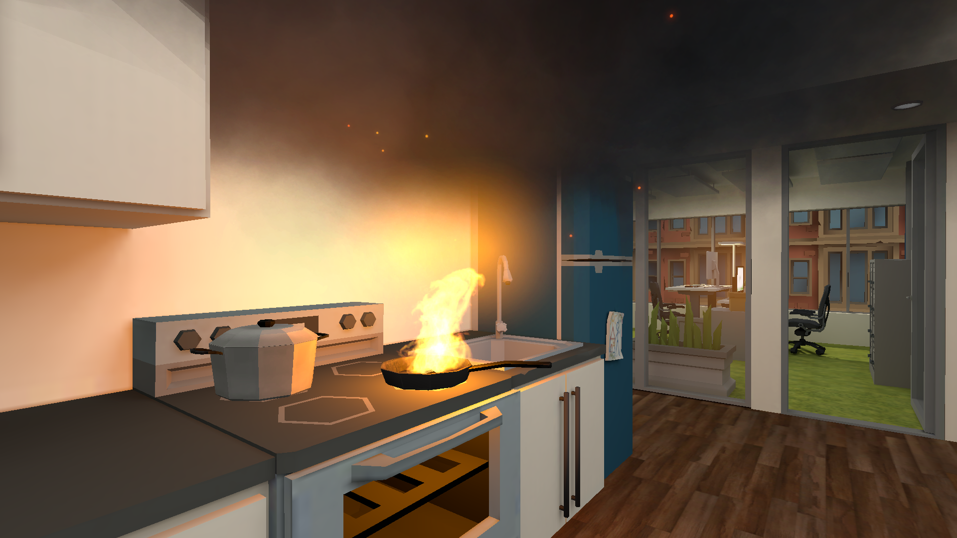 Bei der "Feuer löschen"-Schulung stehen diverse Brände (Mülleimer-, Server-, Drucker- und ein Fettbrand) zur Verfügung. Dabei erlernen die Nutzer die korrekte Vorgehensweise beim Brand (z.B.: nicht mit Wasser auf den Fettbrand oder den Elektrobrand, betätigen der Feuermeldeanlage, Nutzung des passenden Feuerlöschers). Wie so eine VR-Schulung aussieht, wird in diesem Video hier deutlich.