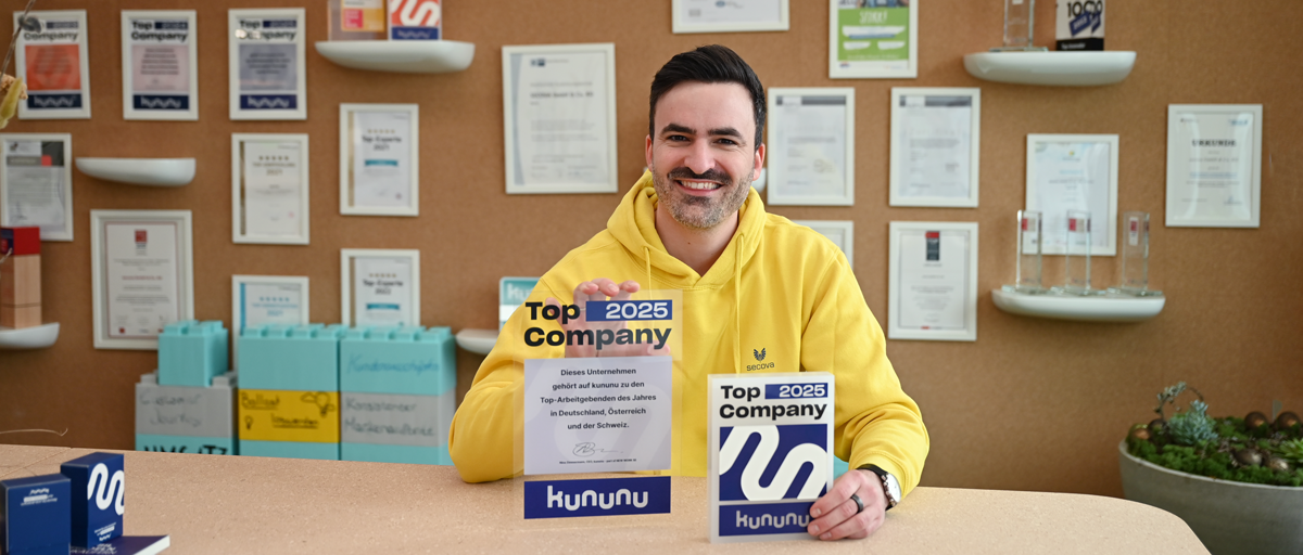 Insgesamt bewerten die Mitarbeitenden im Team secova ihre Zufriedenheit mit der Unternehmenskultur mit 4.9. Das kununu-Gütesiegel gliedert sich ein in eine lange Reihe von Auszeichnungen, die secova in den vergangenen Jahren erhalten hat. So wurde das Unternehmen 2024 gleich in fünf Kategorien als Top-Arbeitgeber bei „Great Place to Work“ ausgezeichnet, darunter als zweitbestes Unternehmen Deutschlands (51-100 MA).