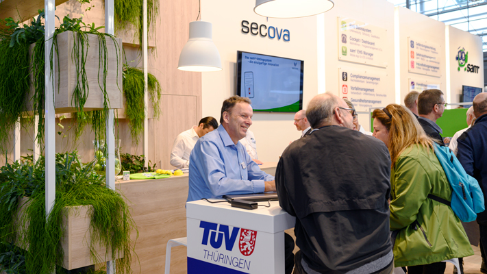 Partner am Messestand bei der A+A 2019 war der TÜV Thüringen. Er hat die Prozessqualität bei der sam®-Gefährdungsbeurteilung genau geprüft und allesamt als korrekt bescheinigt. Die entsprechende "TÜV-Plakette" erhält secova in Kürze.