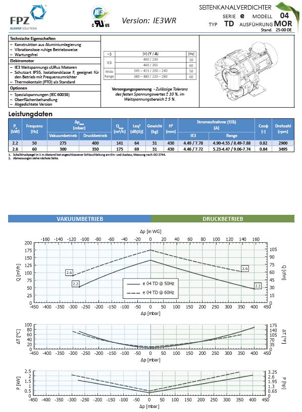 Der Seitenkanalverdichter e11MS ist eine leistungsstarke und energieeffiziente Lösung, die speziell für anspruchsvolle Anwendungen in der Verpackung und Papierverarbeitung entwickelt wurde. Mit einer beeindruckenden Leistung von 18,5 kW, einem Fördervolumen von 939 m³/h und einem Druckbereich von bis zu +450 mbar bietet der Verdichter die perfekte Kombination aus Kraft und Zuverlässigkeit. Dank seines IE3-Motors erfüllt er höchste Anforderungen an Energieeffizienz und Nachhaltigkeit.