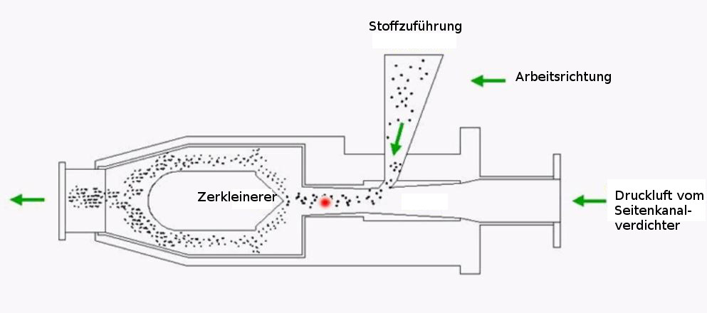 Das hochgeladene Bild zeigt eine schematische Darstellung des Funktionsprinzips einer Strahlmühle. Das Bild hat eine Größe von 993 x 440 Pixeln im Querformat und ist im RGB-Farbmodus gehalten. Es illustriert die Arbeitsweise der Strahlmühle, in der Partikel durch Druckluft des Seitenkanalverdichters beschleunigt und im Zerkleinerungsbereich verarbeitet werden. Die Stoffzuführung erfolgt vertikal, während die Arbeitsrichtung nach links zeigt. Beschriftungen wie „Zerkleinerer“ und „Druckluft vom Seitenkanalverdichter“ verdeutlichen die wichtigen Komponenten des Prozesses.