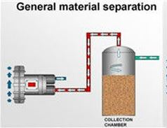 Dank seiner kompakten Bauweise und vibrationsfreien Konstruktion ist der e07MD einfach in bestehende Systeme zu integrieren. In der dargestellten Anwendung wird das Material effizient in eine Sammelkammer transportiert, was eine saubere und effiziente Arbeitsumgebung gewährleistet.