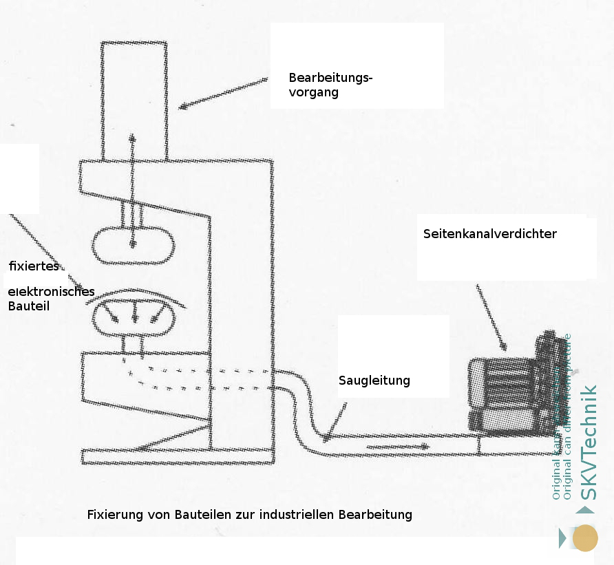 Das abgebildete Szenario zeigt den R30MD Seitenkanalverdichter, der für das sichere Fixieren elektronischer Komponenten während eines Bearbeitungsprozesses sorgt. Über eine Saugleitung erzeugt der Verdichter ein Vakuum, das die Bauteile präzise an ihrer Position hält. Dies ermöglicht eine stabile Bearbeitung und reduziert Fehlerraten signifikant.
