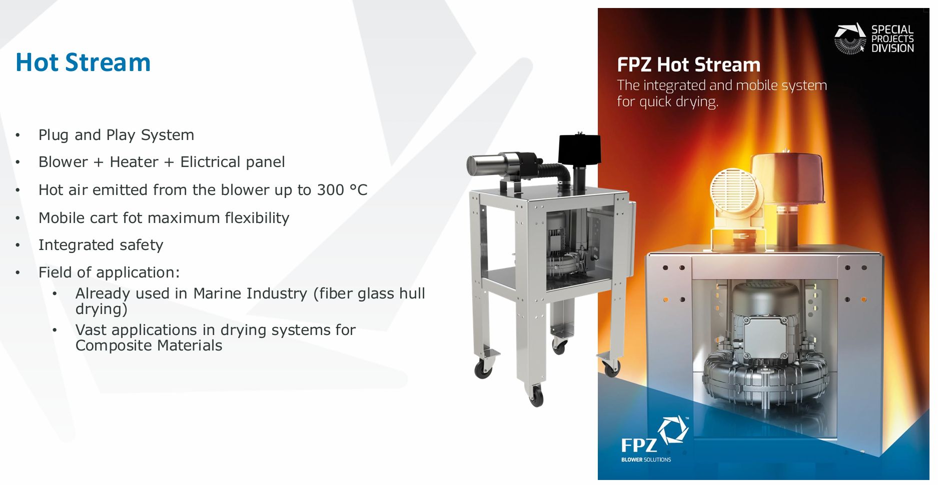 Das abgebildete System, bekannt als "Hot Stream", zeigt die ideale Integration des FPZ SE08TS50 in mobile Trocknungssysteme. Dieses Plug-and-Play-System kombiniert Blower, Heizung und ein elektrisches Panel, um Heißluft mit Temperaturen bis zu 300 °C zu erzeugen. Die Mobilität des Systems ermöglicht eine flexible Anwendung, etwa in der Marineindustrie zur Trocknung von Glasfaserrümpfen oder bei der Verarbeitung von Verbundmaterialien.