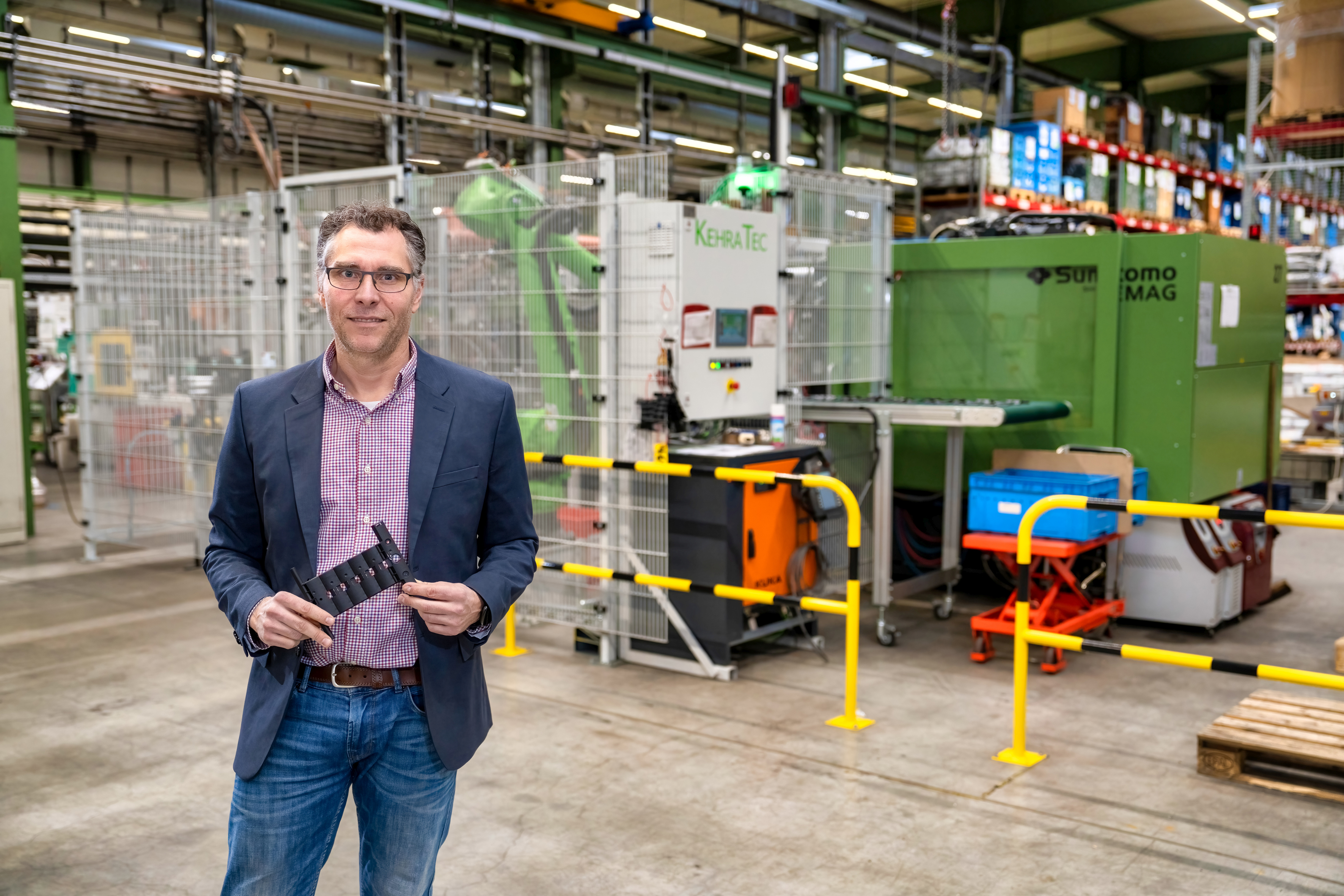Für diese Spritzgießmaschine investierte SELVE den mit Abstand größten Einzelbetrag, sie schlug mit knapp 600.000 Euro zu Buche. Zusätzlich kam eine hohe fünfstellige Summe für eine neue Krananlage hinzu, die in zentimetergenauer Maßarbeit in einem Stück in die Halle eingebracht wurde. „Stetig steigende Bedarfe machen es erforderlich, dass wir SecuFix teilweise auf drei Anlagen und Werkzeugen parallel fertigen“, ordnet Marc Solzbacher die Beweggründe ein: „Die Zykluszeit liegt hier jetzt bei circa 30 Sekunden für jeweils zwei Ketten unterschiedlicher Längen.“ Durch die Neuanschaffung können fortan 50 Prozent mehr Teile pro Jahr hergestellt werden.