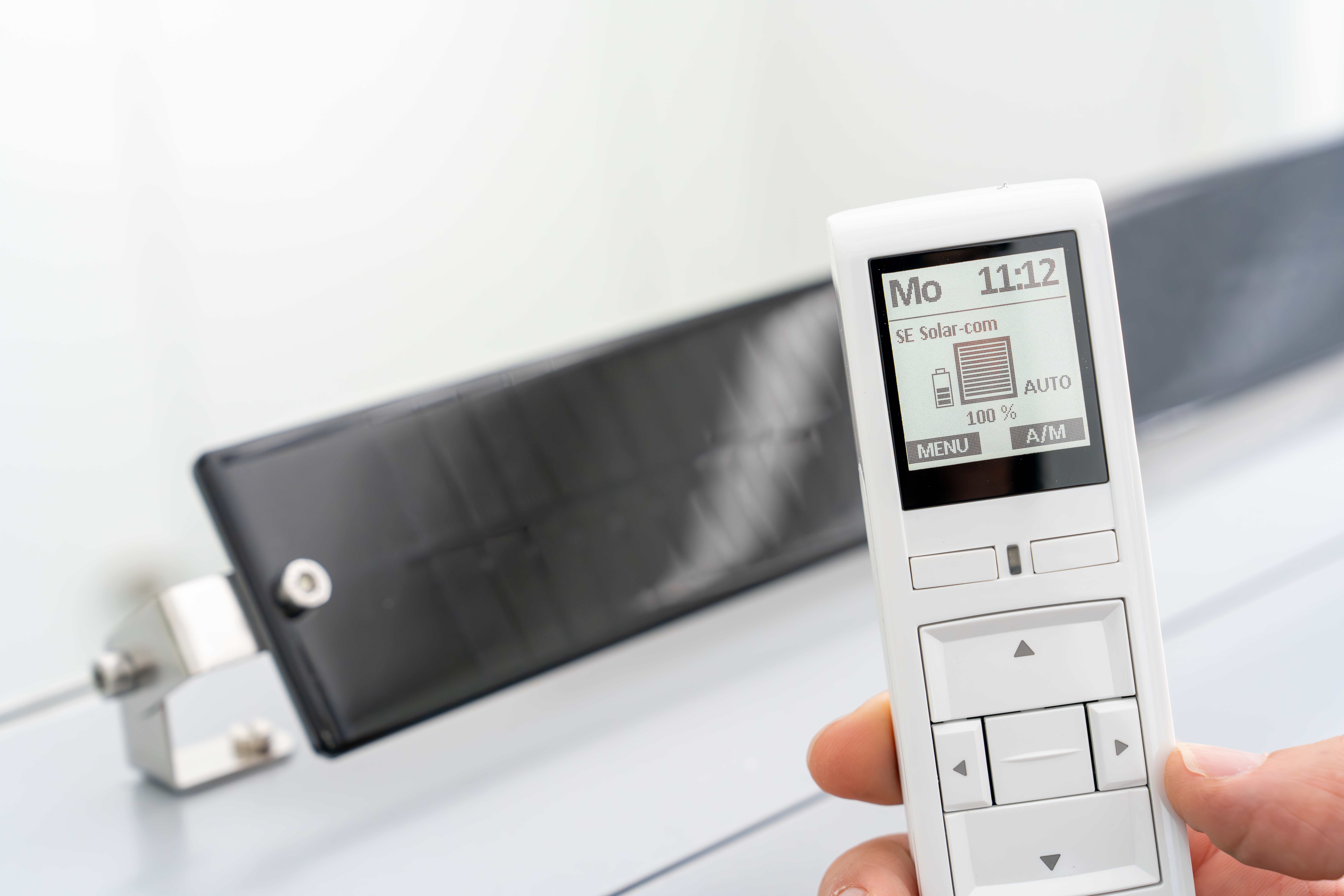 Der SE Solar-com passt in alle gängigen Rollladenkästen. Die für den Antrieb benötigte Energie wird von einem Solarpanel produziert und im hochwertigen Nickel-Metallhydrid-Akku zwischengespeichert. Das Solarpanel lässt sich ganz einfach am Kasten oder auf der Fassade montieren, es wird geklebt oder verschraubt. „Die Installation und Inbetriebnahme sind absolut unkompliziert“, hebt Jörn Wilberg hervor. Durch die Steuerung mit commeo-Funk sei auch das Fahren der Behänge „völlig easy und komfortabel“: Wird dafür der Funkhandsender commeo Multi Send verwendet, „bieten wir noch ein äußerst praktisches Feature, das beim Endkunden für Sicherheit sorgt“, so der Verkaufsleiter Deutschland. Die 5-stufige Ladestandsanzeige auf dem Display gibt Auskunft zum aktuellen Akku-Ladestand. Über commeo hinaus ist die Einbindung des solarbetriebenen Antriebs übrigens auch in das smarte SELVE Home System möglich.