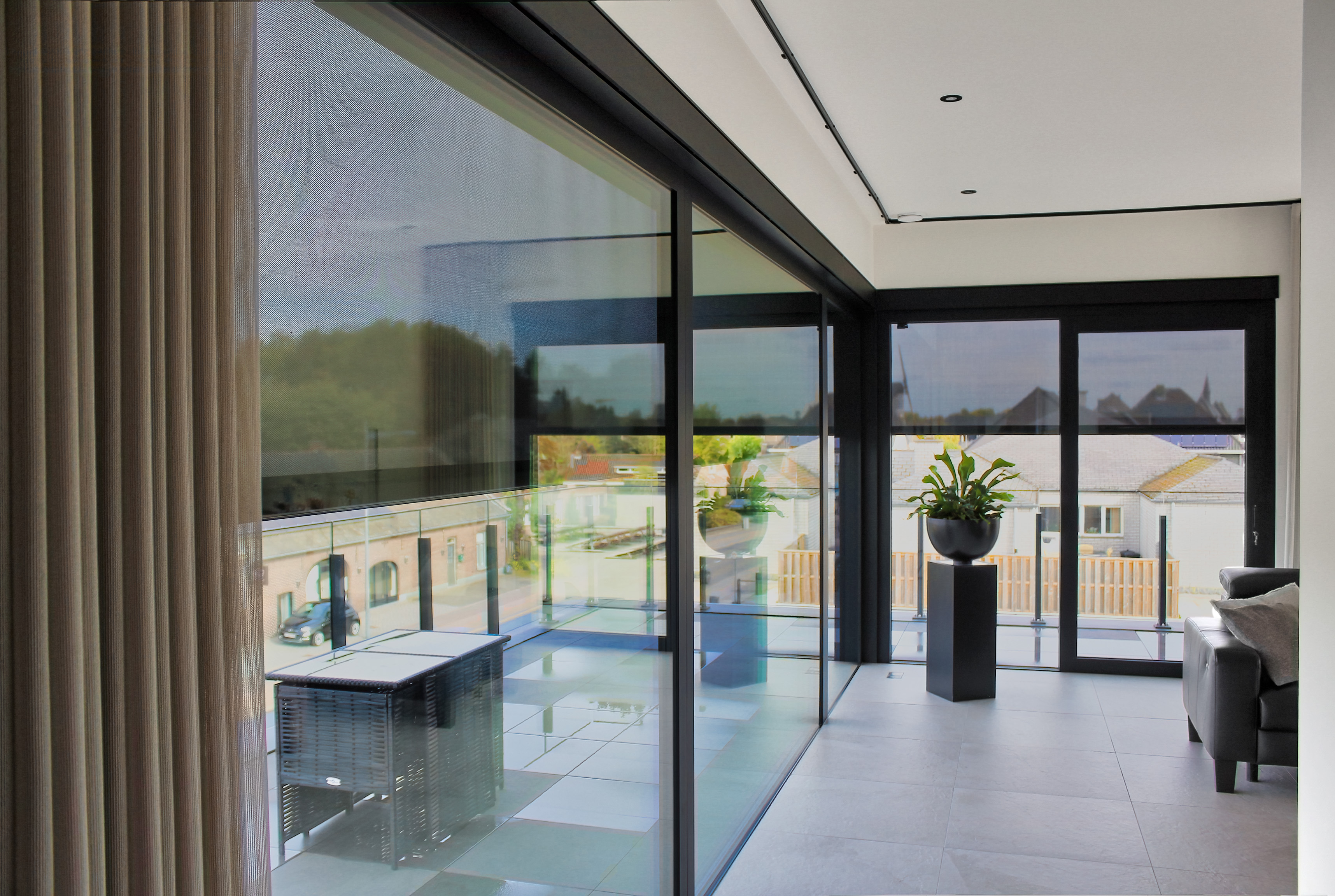 Der spezielle Charakter der Penthouse-Wohnung wird durch große Fensterflächen geprägt. Die schwarzen Aluminiumfenster stammen von Profel, einem großen Fensterhersteller aus Belgien. Das Unternehmen ist – genauso wie der renommierte Sonnenschutzproduzent Wilms – seit vielen Jahren Fachkunde von SELVE. Von Wilms aus dem belgischen Meerhout wurden die passgenauen Zip-Screens projektiert und maßgefertigt, die nun bei Yvonne und Henk van Horne für optimalen Licht- und Sonnenschutz sorgen.