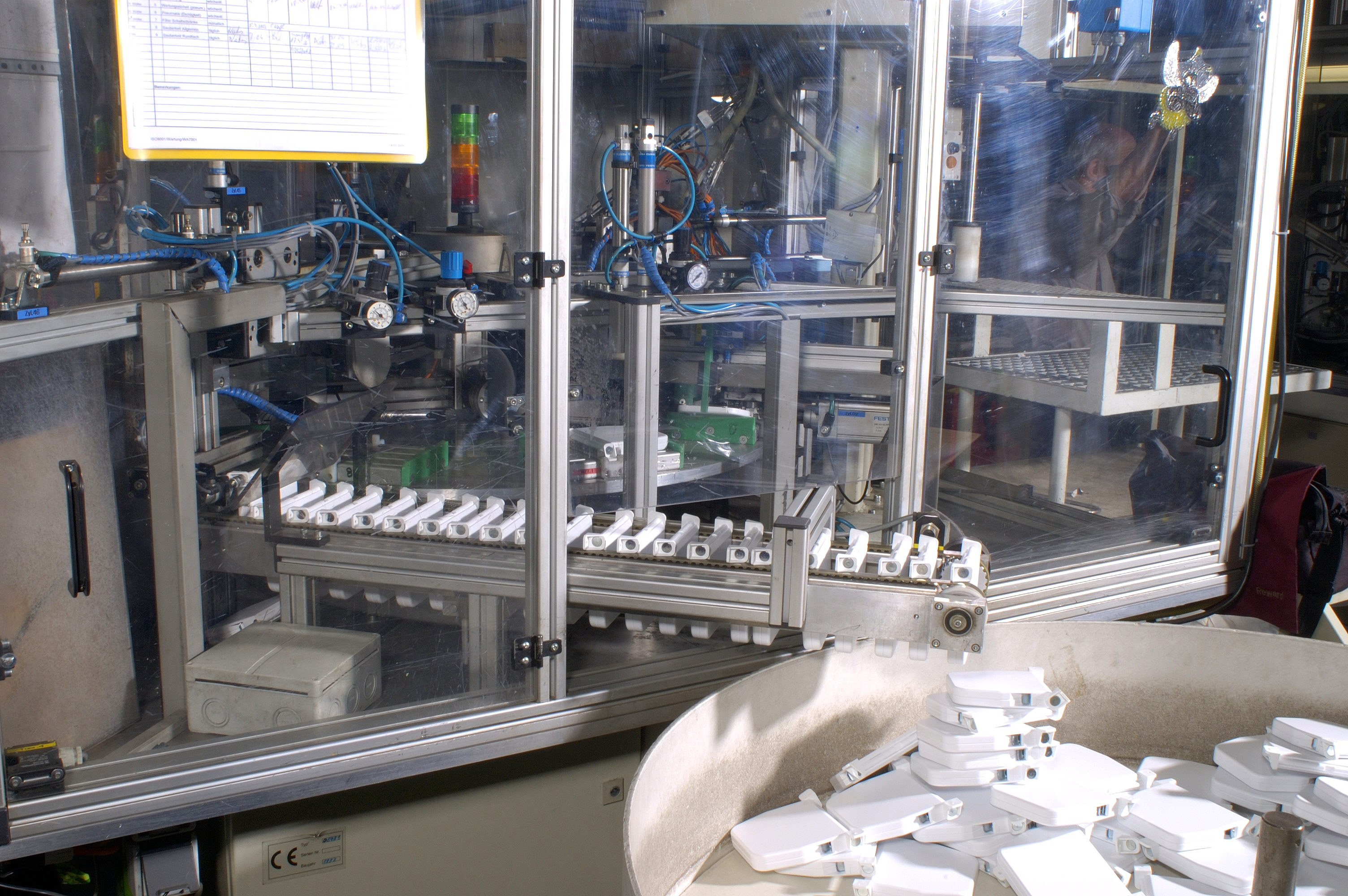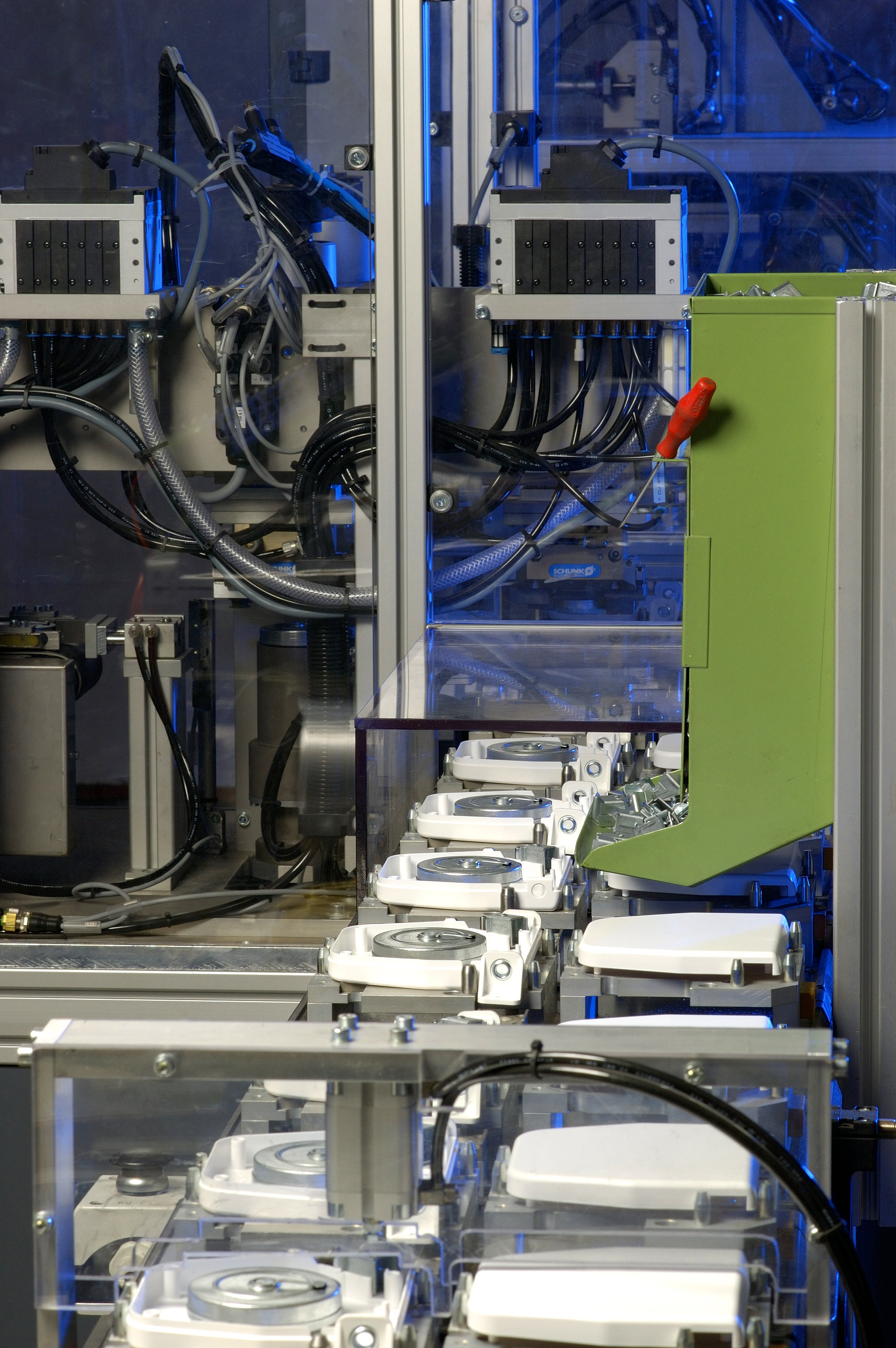 Aus vier Komponenten besteht das Innenleben der Gurtwickler, die sich im Transfersystem der Automaten zu einer Einheit fügen: die Federdose, der Federstahl als "Herzstück", um den Gurt wieder einzuziehen, sowie ein Verschlussdeckel und die "Achse" (Führungshülse). Im Anschluss dieses Prozesses erhält dann ein jeder Wickler sein schützendes Gehäuse - je nach Modell in press- oder klappbarer Ausführung. "80 Prozent unserer Artikel werden unter diesen hochmodernen Rahmenbedingungen gefertigt", berichtet Betriebsleiter Otto Emde. Die restlichen 20 Prozent werden im Stück-Akkord von Menschenhand montiert. Vorteile der herkömmlichen Produktion sind: "Zum einen kann SELVE seinen Kunden so eine sehr hohe Variantenanzahl unterschiedlichster Gurtwickler bieten, zum anderen sind wir sehr flexibel und können spezielle Sonderanfertigungen in kleineren Stückzahlen produzieren", sagt Emde.