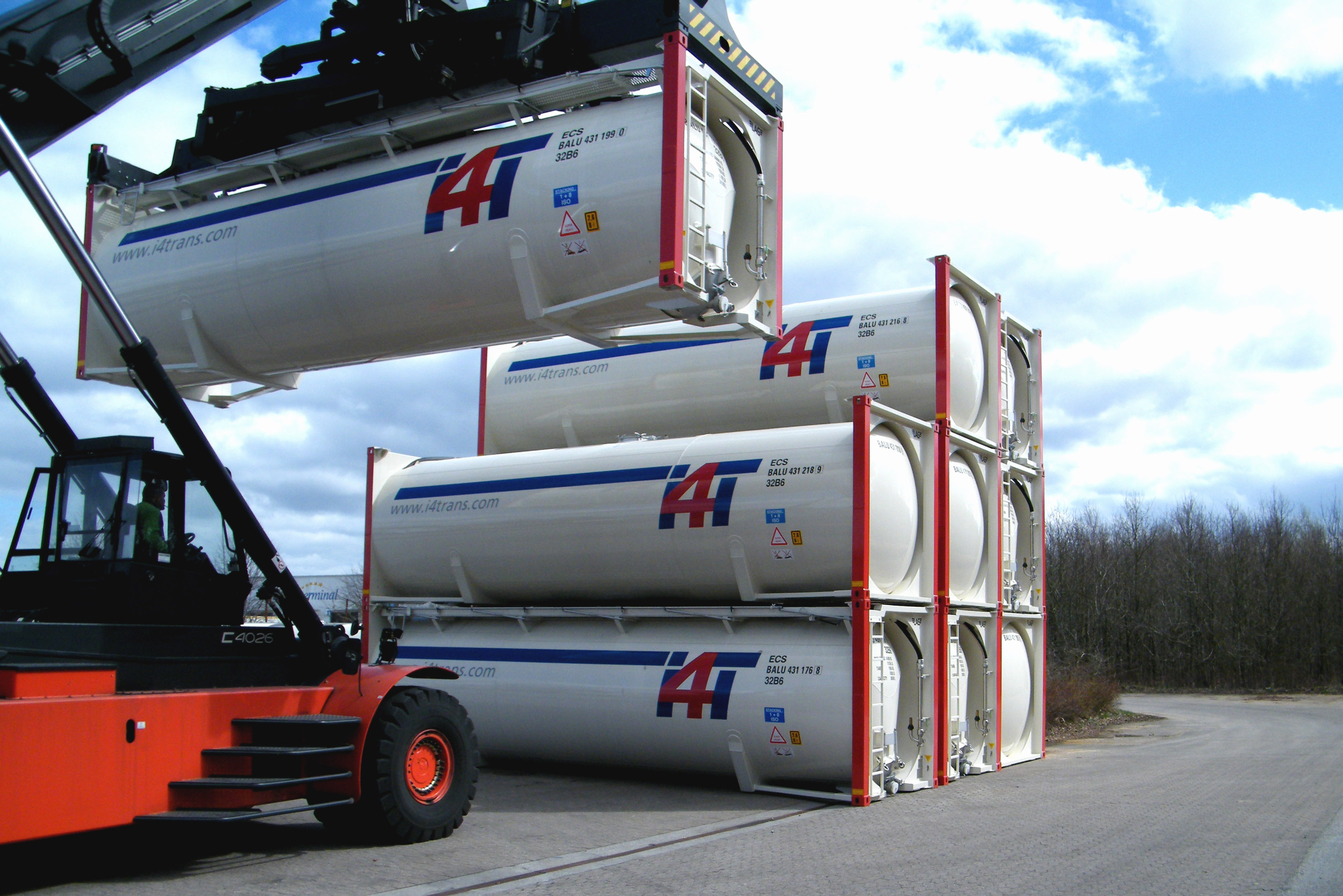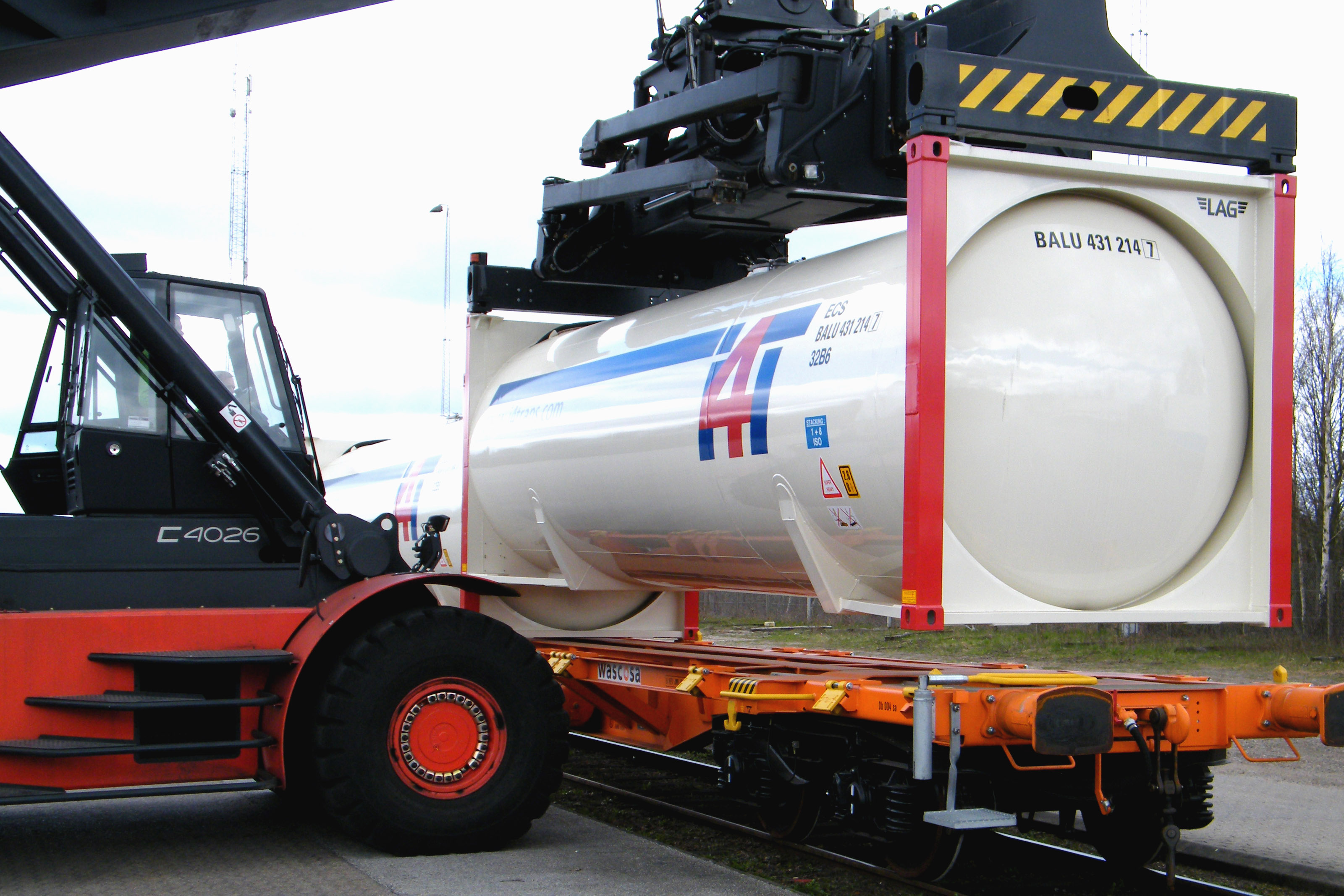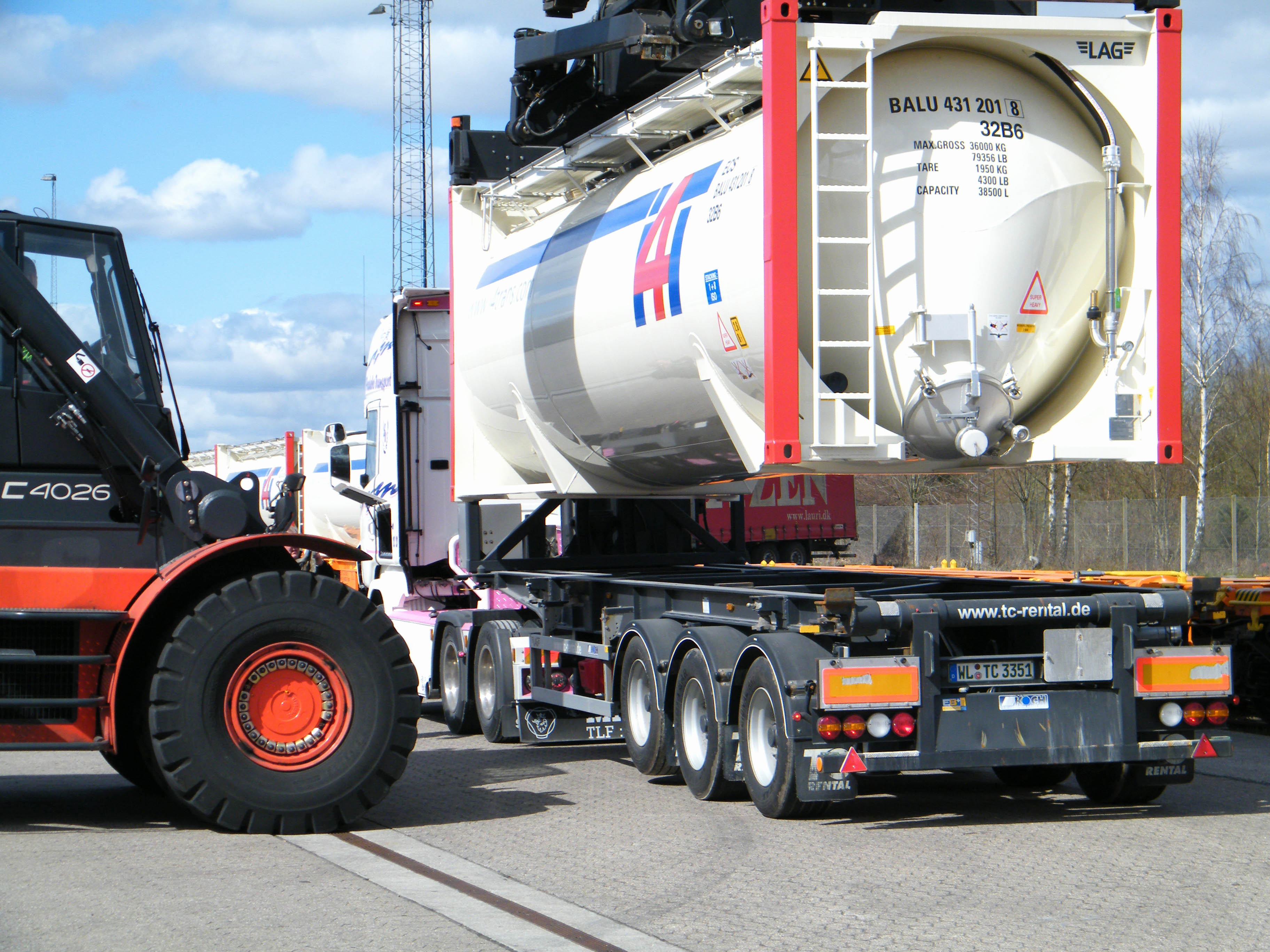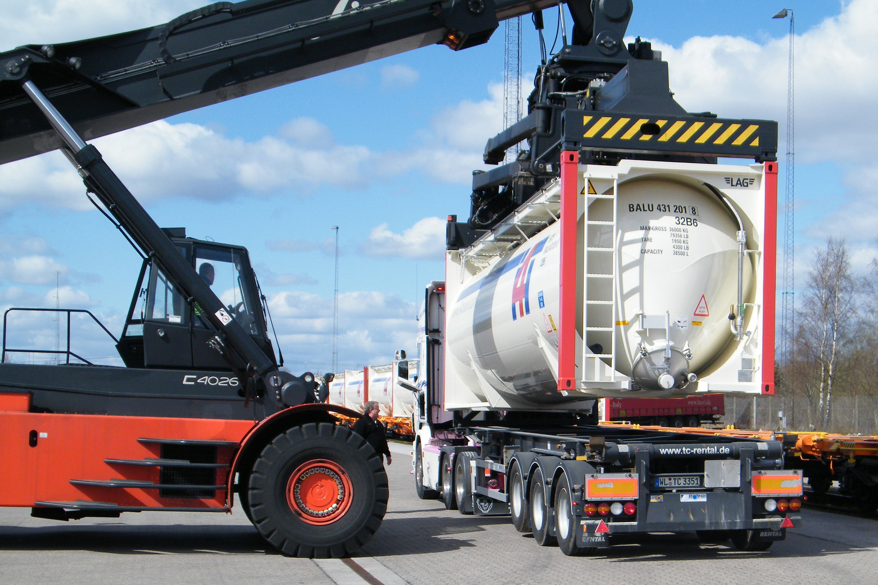 Intermodaler Verkehr: Verladesituation von Silo-Containern.