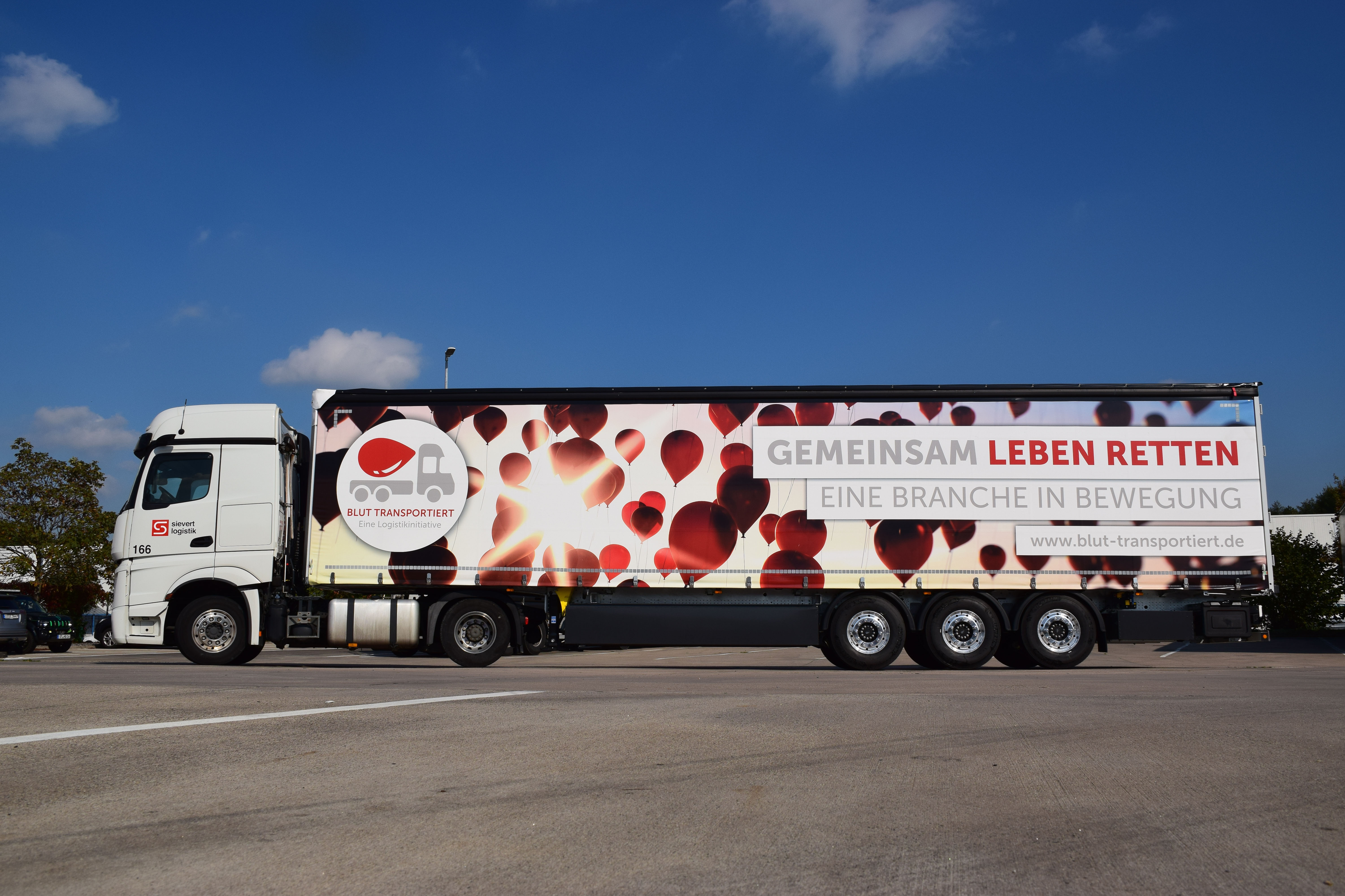 Mit der neuen Plane für einen Auflieger will die Sievert Logistik SE mehr Aufmerksamkeit für das Thema Blutkrebs und dessen Bekämpfung erreichen.
