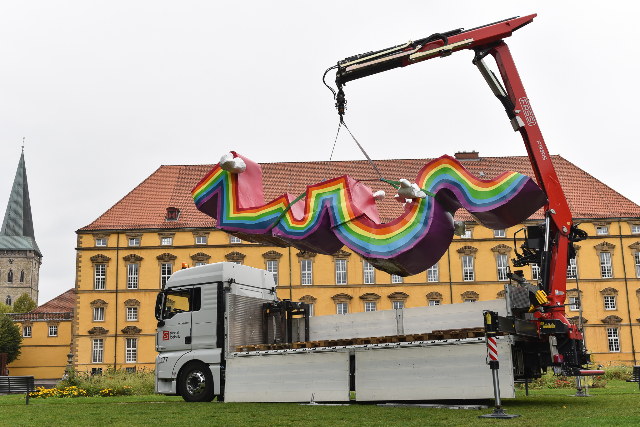 Kunsttransporte stehen nicht im umfangreichen Leistungsverzeichnis der Sievert Logistik SE. Aber da Herausforderungen die Lengericher Logistikspezialisten schon immer besonders reizen, haben sie jetzt trotzdem einen solchen durchgeführt und mit viel Fingerspitzengefühl erfolgreich David Rauers Blechplastik ALLESWIRDGUT umgesiedelt. Das Kunstwerk war im Sommer dieses Jahres im Osnabrücker Schlossgarten aufgestellt worden und musste wegen Umbauarbeiten nun versetzt werden. (Foto: Sievert Logistik
