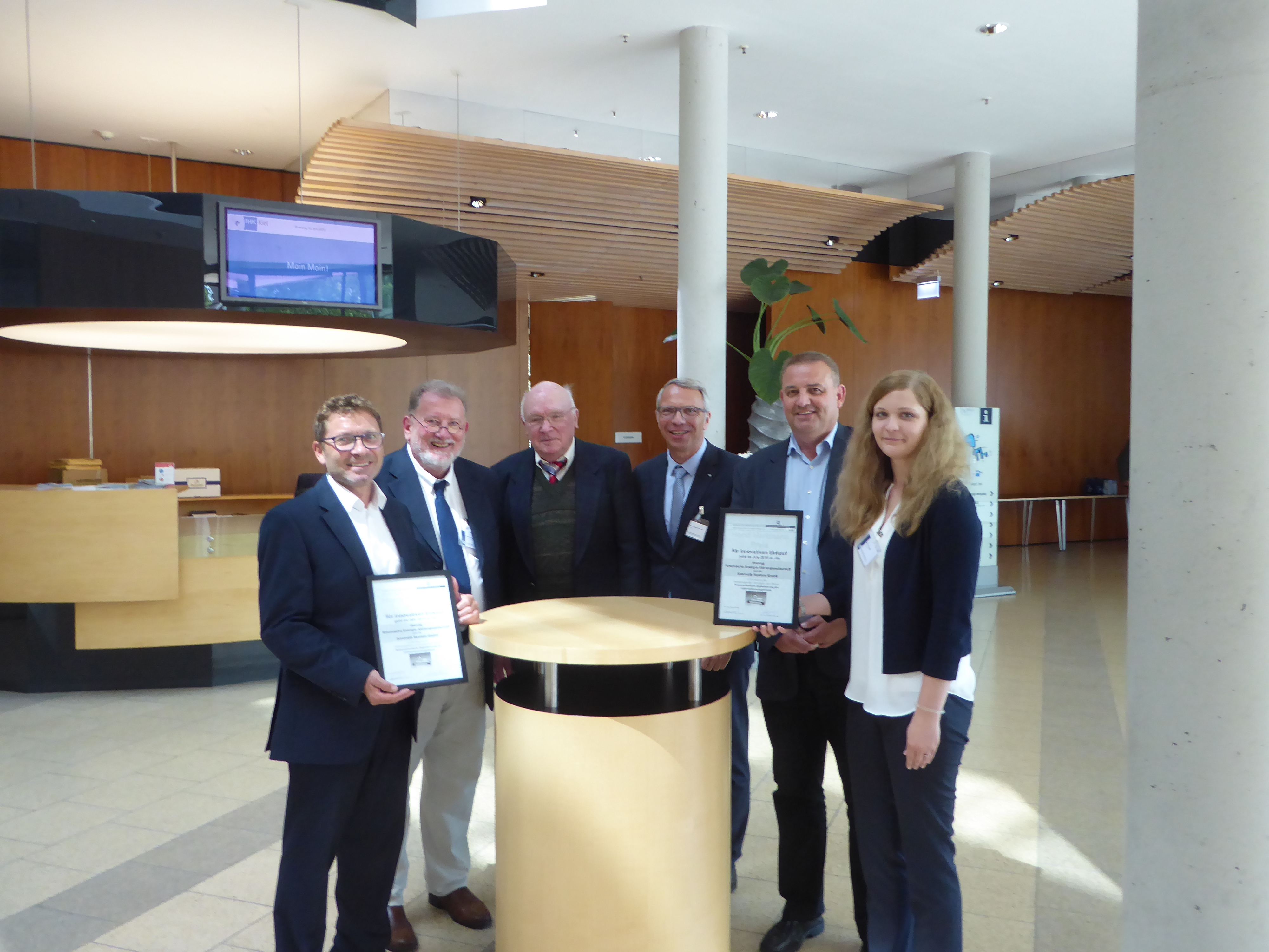 Übergabe des Horst-Hartmann-Preises an die Preisträger (v.l.n.r. Markus Simmeth (Simmeth System, Wilfried Krokowski (GPS Logistik), Prof. Dr. Horst Hartmann (FH Kiel), Prof. Dr. Klaus Dieter Lorenzen (FH Kiel), Jörg Koch (rhenag), Anna Houben (rhenag))