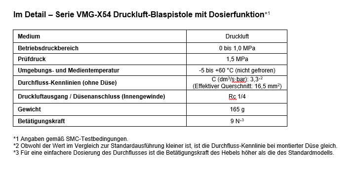 Die neue Serie VMG-X54 verfügt – genau wie ihr Vorgänger – über einen Betriebsdruckbereich von 0 bis 1,0 MPa und sorgt damit für eine hohe Reinigungsleistung. Über den Betätigungshebel lässt sich der Durchfluss jetzt auch sehr präzise dosieren: Je nach aufgewandter Betätigungskraft des Hebels, welche insgesamt höher ist als beim Vorgängermodell, lässt sich der Durchfluss äußerst genau kontrollieren und linear steigern. Damit können zum einen auch leichte Werkstücke per Druckluft gereinigt werden, ohne diese zu verschieben oder wegzublasen. Und zum anderen lassen sich empfindliche Oberflächen sehr behutsam von Schmutzpartikeln oder Wassertropfen befreien.