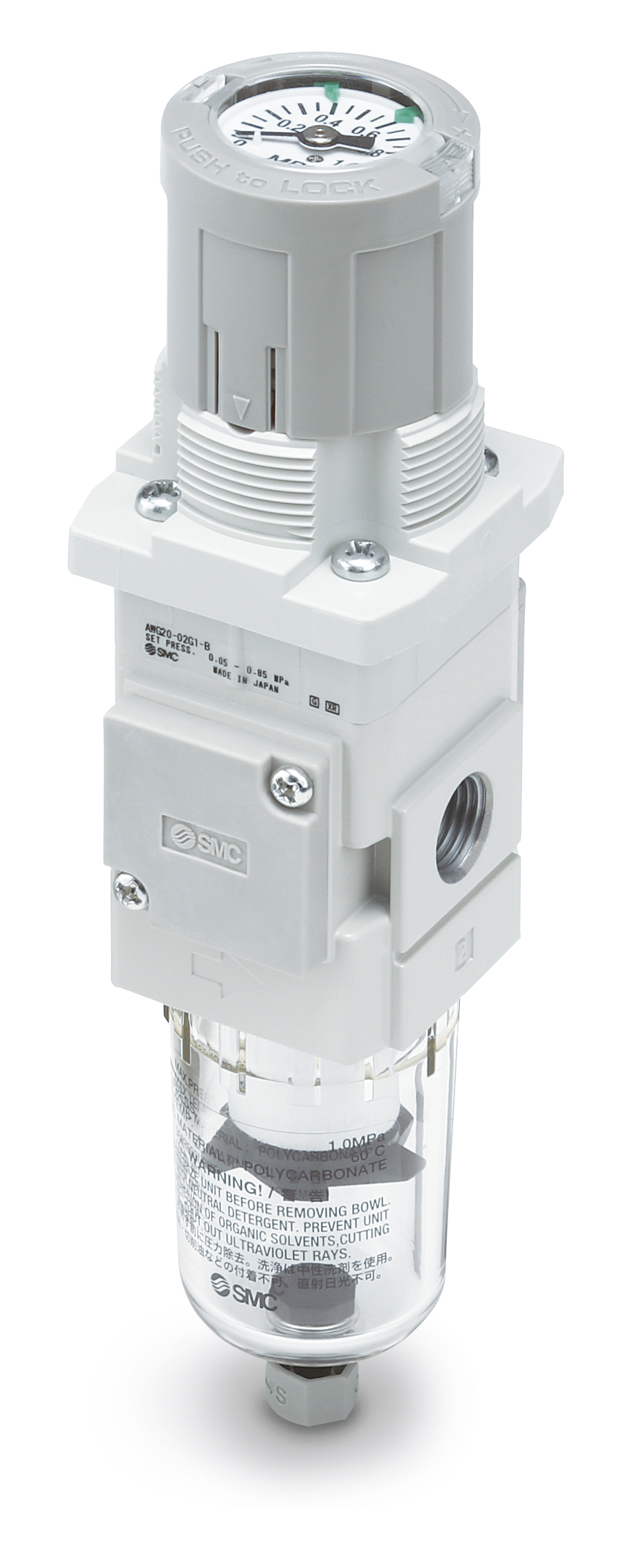 (pressebox) (Egelsbach, 27.10.2020) Bei Pneumatikanwendungen jeglicher Art und über alle Branchen hinweg gehören Regler und Filterregler für Druckluft zu den unverzichtbaren Komponenten, um reibungslose Prozesse zu gewährleisten. Damit Anwender den Druckbereich auch stets im Blick behalten, hat SMC bei der neuen Serie ARG-/AWG-B direkt im Einstellknopf ein Manometer mit Grenzwertanzeige eingebaut. Für noch mehr Einblicke sorgt bei den zur Serie zugehörigen Filterreglern ein transparenter, doppelwandiger Polycarbonatbehälter.