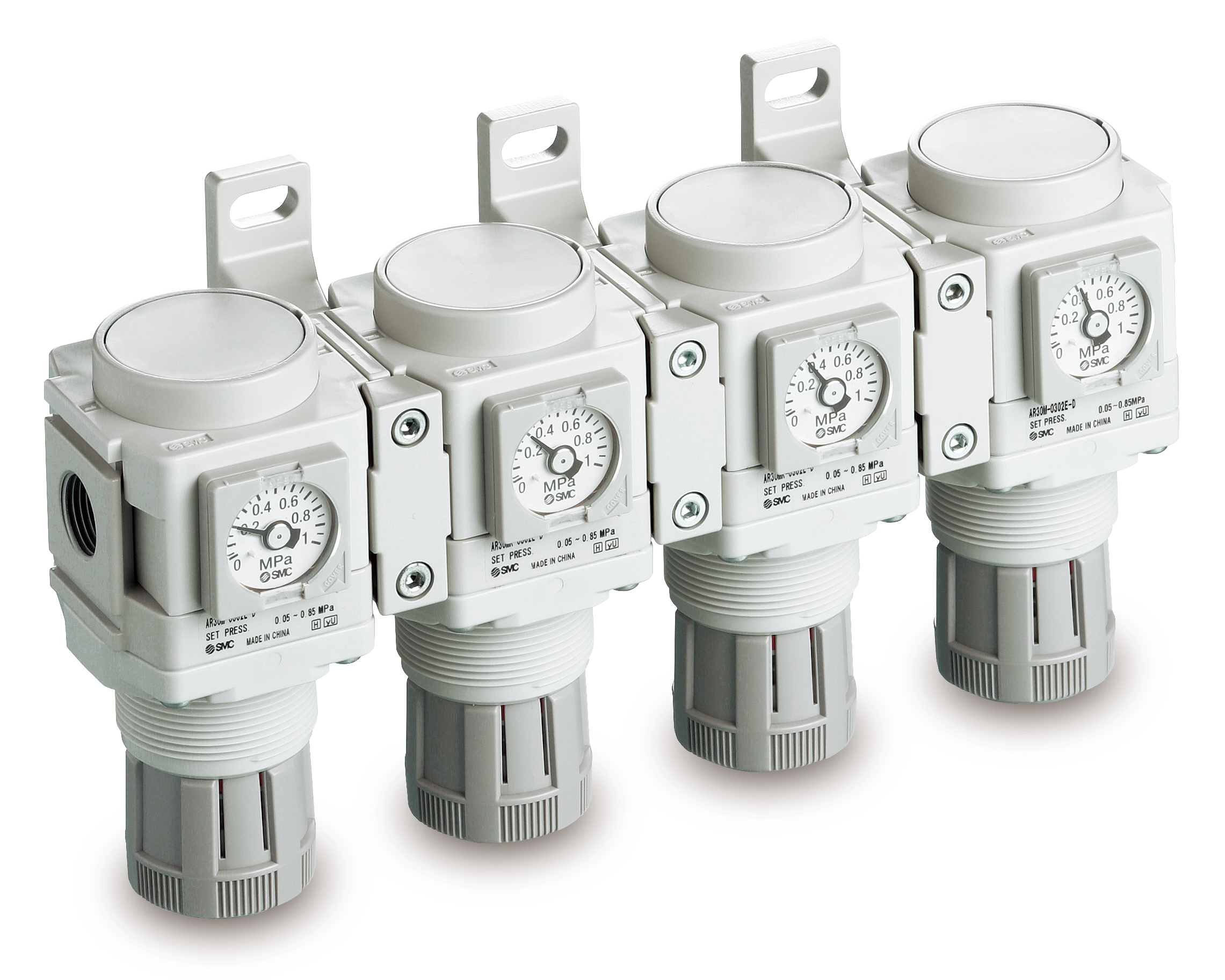 Die einheitliche Gehäusekonstruktion im One-Box-Design hilft außerdem dabei, dass Staub und andere Fremdstoffe sich deutlich schlechter auf der Außenseite der Druckregler ansammeln können. Auch das quadratisch integrierbare Manometer ist ohne hervorstehende Bauteile angebracht, was nicht nur die Verletzungsgefahr reduziert, sondern auch mögliche Beschädigungen am Manometer vermeidet und damit die Beschaffung von Ersatzteilen einschließlich der damit verbundenen Kosten verringert. Leicht ergänzen lassen sich die modularen Druckregler außerdem mit der Wartungseinheit der Serie AC-D, was die Filterung und Ölung der Druckluft ermöglicht.