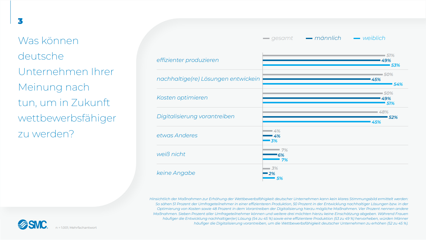 Aus Sicht der Befragten können die Unternehmen selbst deutlich mehr tun, um den Standort zu sichern. Die Produktion „Made in Germany“ müsste effizienter werden, sagen 51 Prozent der Befragten. 50 Prozent sprechen sich für eine „nachhaltigere Entwicklung“ bzw. für eine „Optimierung der Kosten“ aus. 48 Prozent sehen den Knackpunkt beim konsequenten „Vorantreiben der Digitalisierung“.