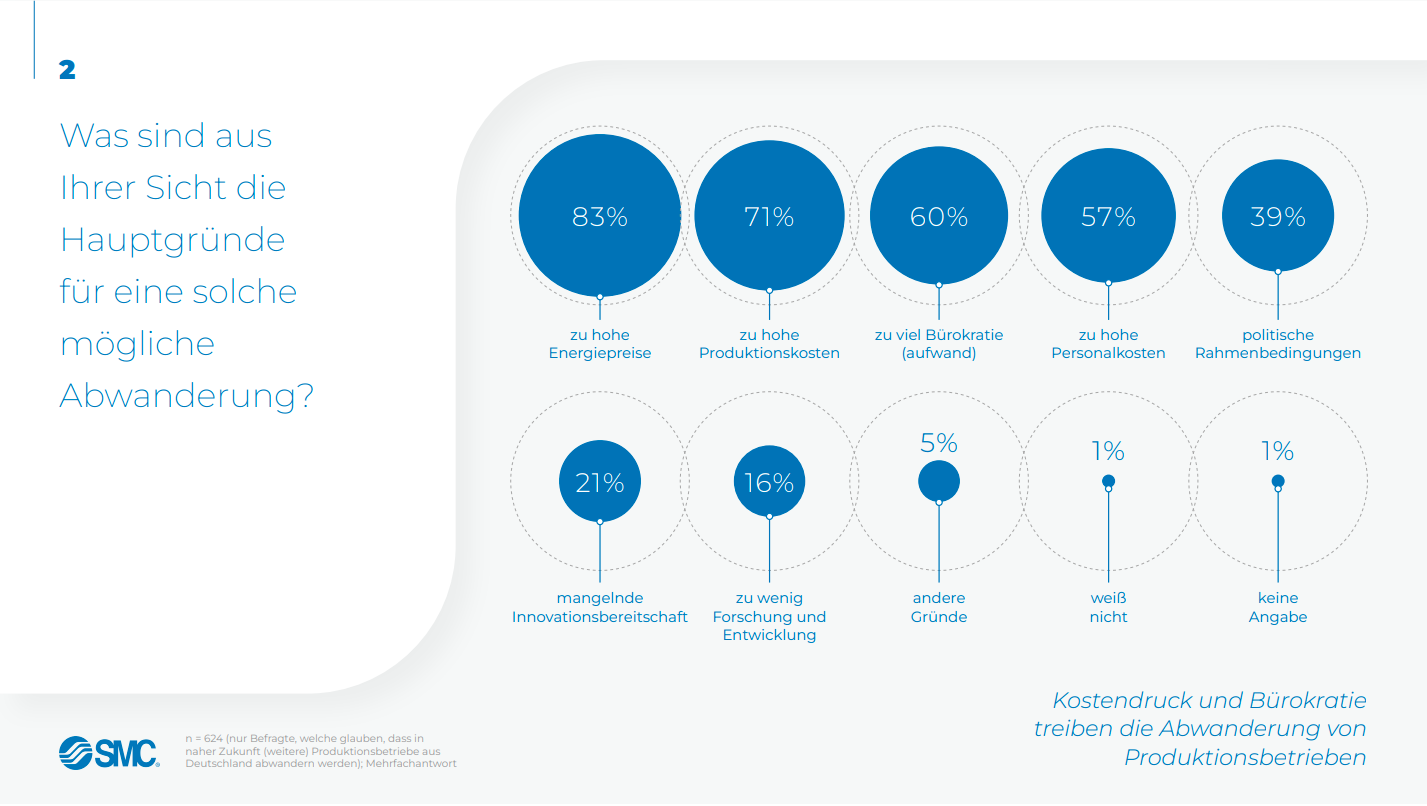 Auch die Gründe dafür liegen, laut Befragung, auf der Hand: steigende Energiepreise (83 Prozent), hohe Produktionskosten (71 Prozent), Bürokratieaufwand (60 Prozent), hohe Personalkosten (57 Prozent), politische Rahmenbedingungen (39 Prozent).