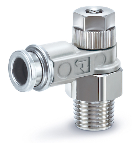 Wenn es gilt, Teile präzise und wiederholgenau zu bewegen, greifen Anwender auf Drosselrückschlagventile zurück. Bei Anwendungen in speziellen Umgebungen mit Schweißspritzern, Staub oder ultravioletter Strahlung müssen die Ventile jedoch besondere Anforderungen erfüllen. Damit Anwender hierbei auf eine zuverlässige, flexible und sichere Lösung setzen können, hat SMC nun die Serie ASB-D entwickelt. Die neuen Drosselrückschlagventile mit Steckverbindung und Sicherungsmutter überzeugen dank Außenteilen aus Metall mit einer verbesserten Umweltbeständigkeit und sind somit für den Einsatz in rauen Umgebungen und Außenbereichen geeignet. Eine nur mit Gabelschlüssel bedienbare Sicherungsmutter verhindert das unbeabsichtigte Verstellen der Nadelposition. Darüber hinaus ist die Serie ASB-D noch kompakter konstruiert und bietet durch verschiedene verwendbare Schlauchaußen-Ø und eine breite Auswahl bei den Anschlussgrößen ein hohes Maß an Flexibilität.
