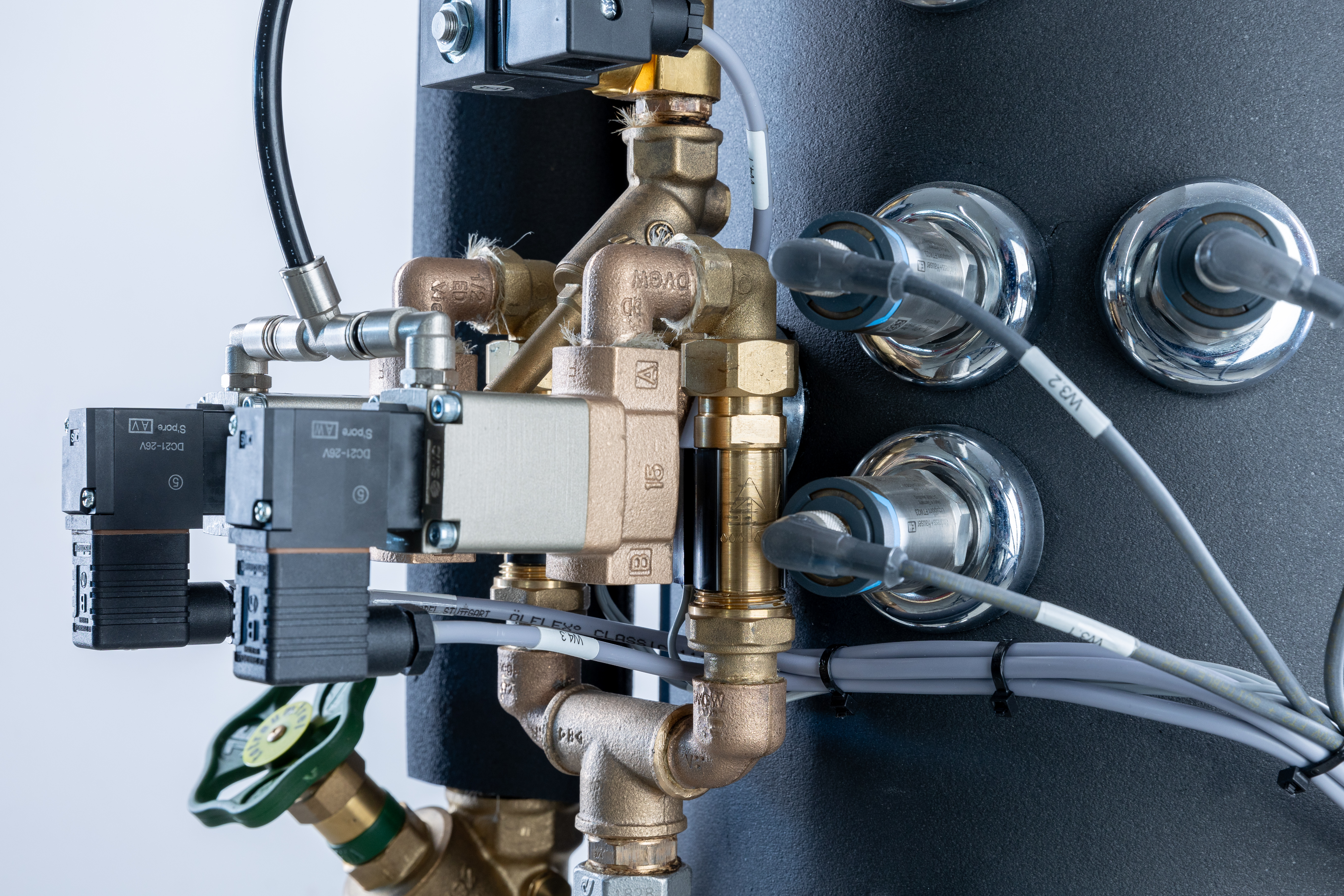 Bei der ProTrenn T8 fällt Wasser zunächst durch eine unter Druck stehende Hygienezone der Trennstation. Dabei sorgt UV-C-Licht für eine sterile Trennung von Trink- und mikrobiell belastetem Wasser. Die Verbindung von Wasser aus dem Hausnetz und einfallendem Trinkwasser wird mittels Luftnachspeisung, der Anwendung eines umgekehrten Siphonprinzips sowie redundanter Ventil- und Steuerungstechnik erhindert. Die Ventile steuern eine im Regelbetrieb geschlossene Spülung. Bei einer Störung öffnen sich die Ventile, um die Anlage zu spülen. Durch die vollständig elektrische Steuerung der Ventile waren sie dauer-bestromt – und verursachten so nicht nur einen hohen Energieverbrauch, sondern erwärmten auch die Ventile und damit das durchströmende Wasser. Die daraus resultierende Kalkbildung ging so weit, dass die Ventile sich nicht mehr schalten ließen. Durchgehende Kontrollen mit anschließender Entkalkung bis hin zum Ventilaustausch waren die Folge. Zuverlässigkeit, Wartungsaufwand und Kosten sollten mithilfe neuer Ventile verbessert werden.