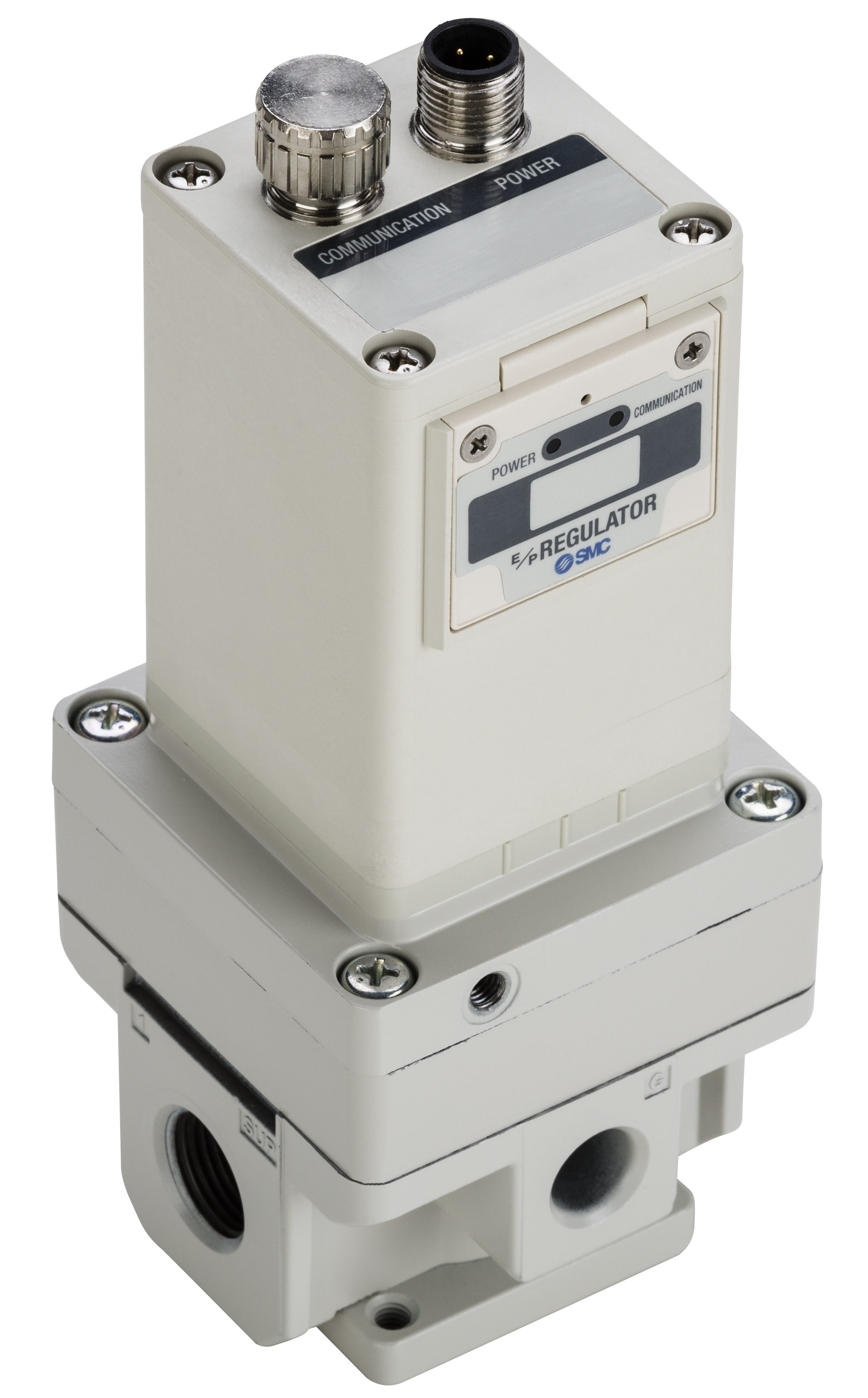 Der neue, elektropneumatische Regler der Serie ITV wurde ebenfalls mit einer IO-Link Schnittstelle ausgestattet und bietet bei einem Versorgungsdruck von 1,2 MPa eine stufenlose Druckregelung von 0 bis 1 MPa. Der Regler unterstützt als IO-Link Device ebenfalls den höchsten Übertragungsstandard COM3 (230 kBit/s). Das Regelverhalten und der Ausgangsdruck des neuen ITV-Proportionalreglers lassen sich bei laufendem Betrieb dynamisch einstellen. Damit ist er gerade im Hinblick auf die Entwicklungen in Richtung Industrie 4.0, wo unter anderem maximale Flexibilität bis zur Losgröße 1 gefordert ist, gut gerüstet. Trotz seiner geringen Abmessung und des minimalen Gewichts von nur 750 Gramm, ermöglicht der neu vorgestellte ITV-Proportionalregler Durchflussraten von bis zu 4.000 l/min. Speziell in stark beengtem Umfeld, oder in dynamischen Anwendungen wie etwa bei der Montage auf einem Roboterarm, sind die kompakte Abmessung und das niedrige Gewicht vorteilhaft.