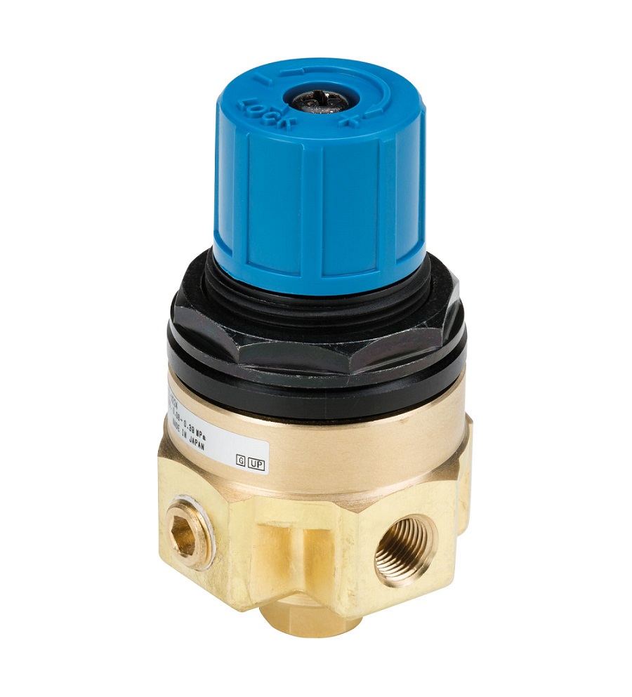 Das Gehäuse der WR110 Druckregler wird aus Messing hergestellt. Als Anschlussgrößen stehen die Gewinde Rc 1/8, 1/4, NPT 1/8, 1/4 zur Auswahl. Ausgelegt sind sie für Umgebungs- und Medientemperaturen von -5 bis 60 °C, wobei auf Frostfreiheit zu achten ist. Der maximale Betriebsdruck liegt bei 0,8 MPa. Die Serie gliedert sich in 2 Modelle mit einem Druckeinstellbereich von 0,08 bis 0,39 MPa (WR110-X224) und 0,05 bis 0,69 MPa (WR110-X215). Mit einem Gewicht von unter 0,26 Kilogramm sind beide Modellvarianten leicht und kompakt und lassen sich ganz einfach auch in beengten Einbausituationen montieren.