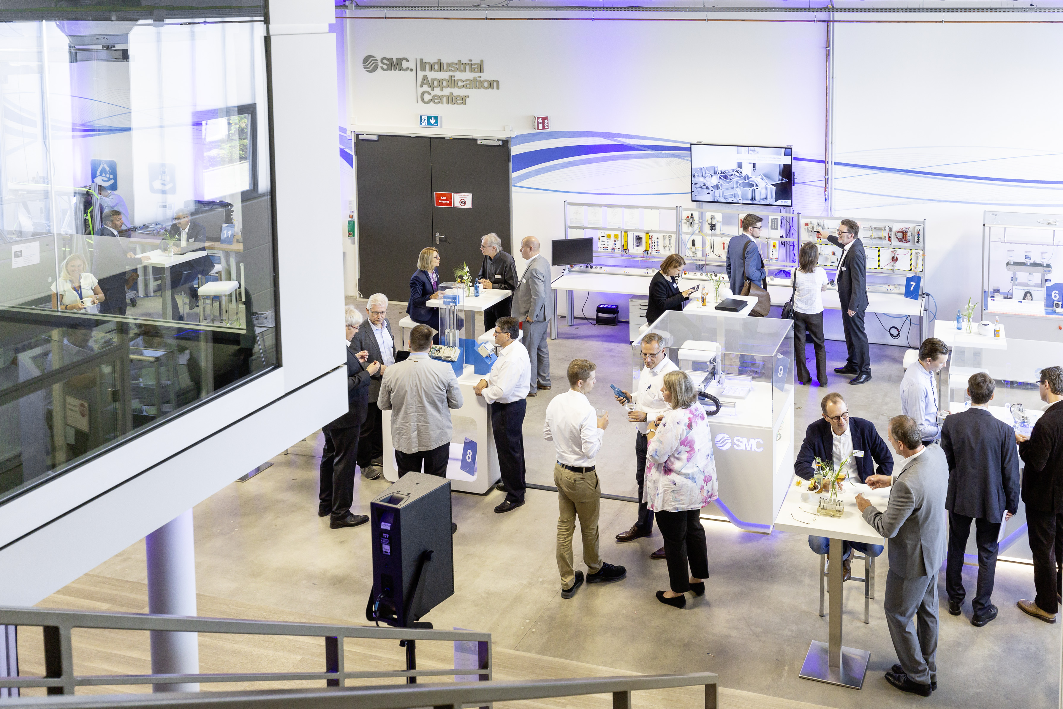 Als einer der ersten Sprecher fasste Ralf Laber, General Manager von SMC Deutschland, in seiner Eröffnungsrede im Industrial Application Center (IAC) die 40-jährige Erfolgsgeschichte des Unternehmens stichpunktartig zusammen. Von ehemals 5 auf heute 745 Mitarbeiter hat sich SMC Deutschland zum führenden Hersteller, Partner und Lösungsanbieter kundenspezifischer Automationslösungen entwickelt. Nach seinen Worten unterstreichen das bereits vor 10 Jahren erbaute German Technical Center (GTC) sowie das 2014 in Betrieb genommene Industrial Application Center (IAC) den Anspruch von SMC, Trendthemen der Branche früh zu erkennen und mit Innovationen eine technische Vorreiterrolle zu übernehmen. Weil dies schon seit Jahren gut gelingt, hat die japanische Muttergesellschaft zuletzt kräftig in den Standort Deutschland investiert. Neben dem Bau des IACs, in dem Kundenentwicklungen erprobt werden, flossen auch beträchtliche Anteile in die Modernisierung der Produktion. Davon konnten sich die Besucher bei einem nachmittäglichen Rundgang selbst überzeugen.