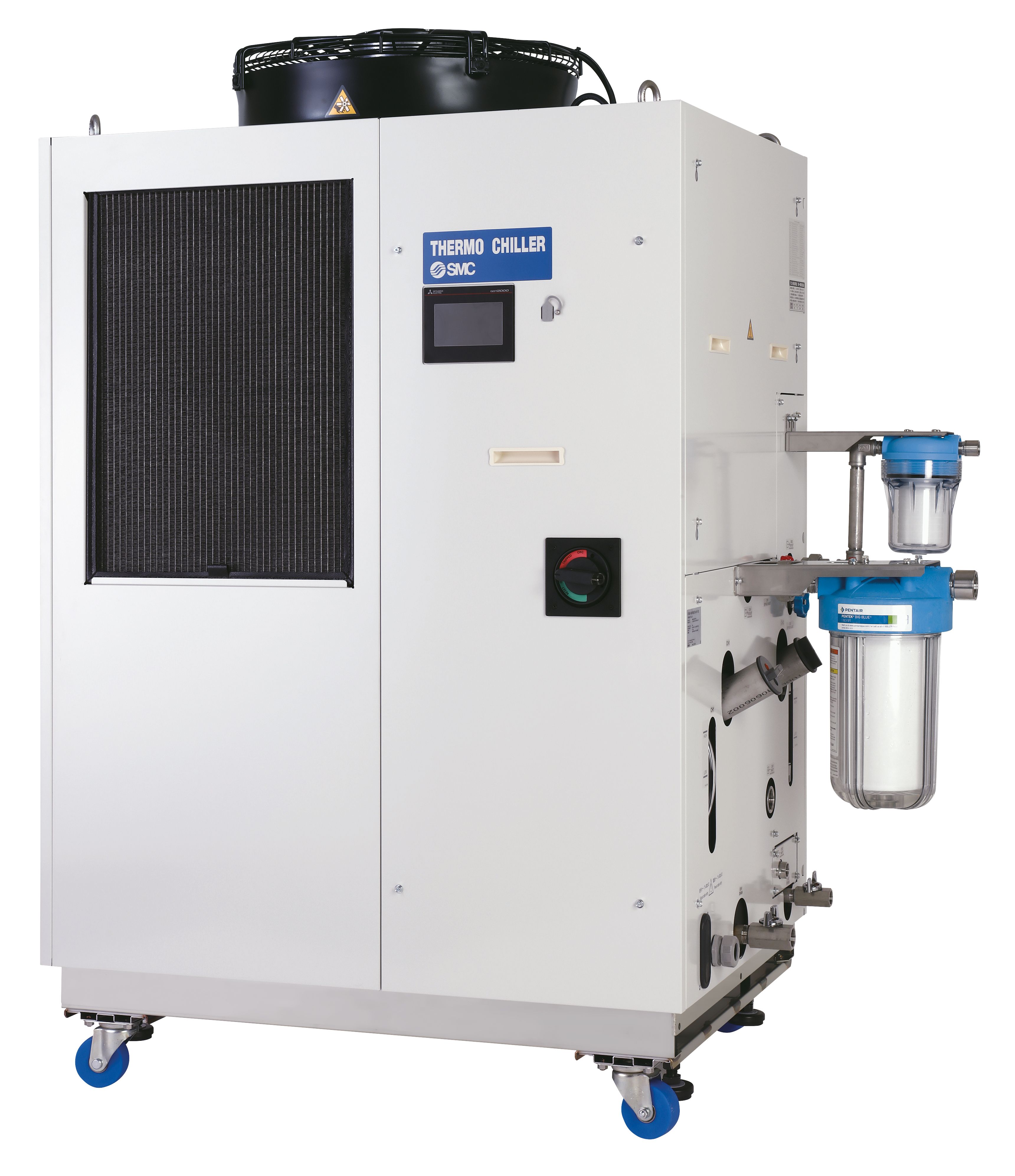 In einigen Industriebereichen, wie den Laseranwendungen oder der optischen Industrie, ist die Kühlung mit deionisiertem Wasser erforderlich. Mit den Geräten der HRL-Serie lässt sich die Kühlung perfekt auf die Wasserspezifikation eines Lasers abstimmen. Ein integrierter Leitwertsensor in Verbindung mit einem Regelventil ermöglicht eine definierte Leitwertregelung. Dazu sorgt ein integrierter Wasserfilter dafür, dass im Kühlsystem keine Verunreinigungen den Betrieb stören. Über einen Bypass werden Druckschwankungen ausgeglichen, sodass die HRL-Geräte äußerst zuverlässig und sicher arbeiten. Sie sind auf Rollen montiert und damit schnell von A nach B versetzt. Bei der Bedienung über ein Touch-Panel hat SMC großen Wert auf eine einfache und bedienerfreundliche Oberfläche gelegt.