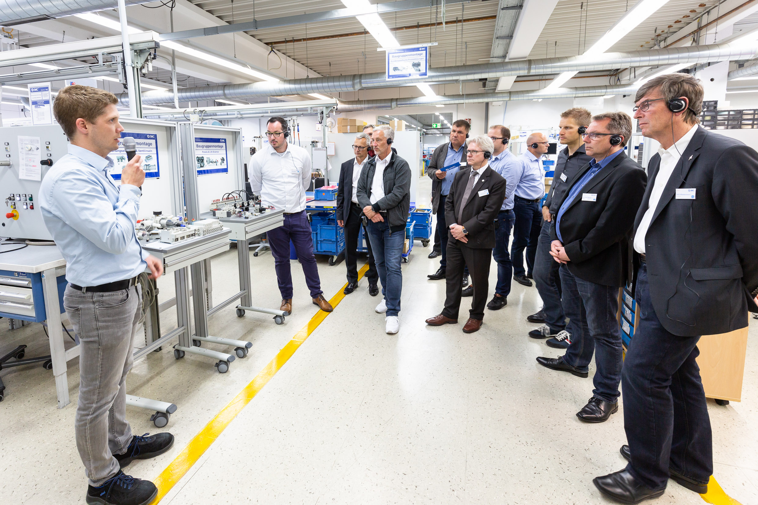 Am Nachmittag standen Rundgänge durch das GTC Zentrallabor (German Technical Center) und die Produktion auf dem Programm. Die Gruppen wurden durch die Produktion bis hin zur Endmontage geführt. Als Hersteller, Partner und Lösungsanbieter legt SMC den Fokus in Deutschland auf individuelle und spezifische Produktentwicklungen. Dabei ist auch die Fertigung kleiner Losgrößen jederzeit kurzfristig umsetzbar. Im GTC Zentrallabor konnten die Besucher verschiedene Testvarianten vom Dauertest bis hin zu kundenindividuellen Anfragen besichtigen. Hier kann nahezu jedes Produkt getestet werden.