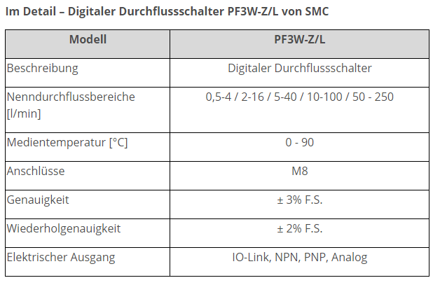 Von der Halbleiter- über die Automobil- bis zur Laserindustrie: Überall müssen Prozesstechniker sicherstellen, dass flüssige Medien ihre Maschinen und Anlagen reibungslos und möglichst im Idealbereich durchfließen. Dazu sind präzise Messungen unverzichtbar. Damit die Prozesseffizienz und -sicherheit garantiert werden kann, haben die Ingenieure von SMC mit der Serie PF3W-Z/L ihre digitalen Durchflussschalter um einen IO-Link-Ausgang ergänzt. Das ermöglicht eine kontinuierliche Gerätediagnose in Echtzeit, um bei Abweichungen unmittelbar reagieren zu können.