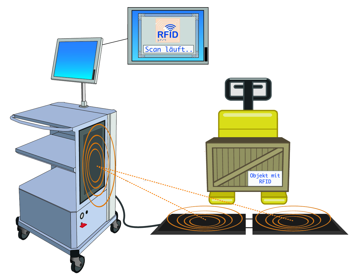 Ohne großen Aufwand lässt sich das mobile RFID-Gate im PKW transportieren und von nur einer Person im Handumdrehen aufbauen. Dazu müssen lediglich die Matten aneinandergesteckt und mit dem Mobilwagen verkabelt werden. Passieren nun mit RFID-Chips getagte Objekte die Matte, werden sie von den im Wagen integrierten Readern im Pulk ausgelesen. Anschließend werden die so ermittelten Informationen an den ebenfalls auf dem Mobilwagen mitgeführten IPC oder Laptop übergeben und dort von einer Software gespeichert und ausgewertet. Auch die sofortige, drahtlose Weiterleitung der Daten an einen Server ist mit den integrierbaren DFÜ-Optionen WLAN und Mobilfunk gegeben.
