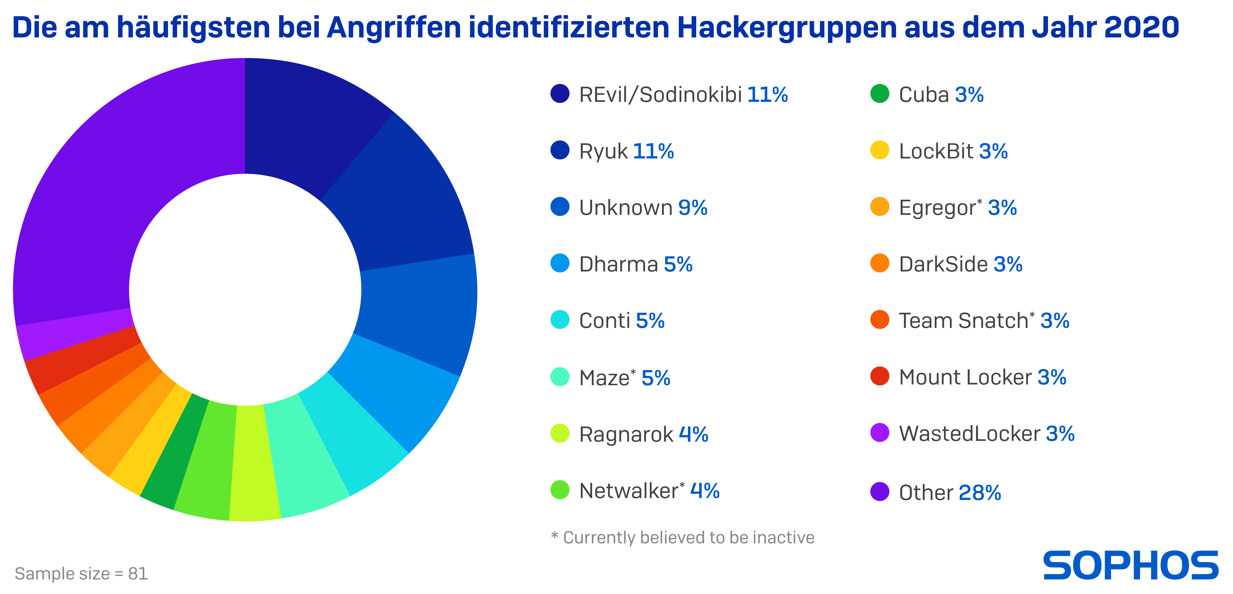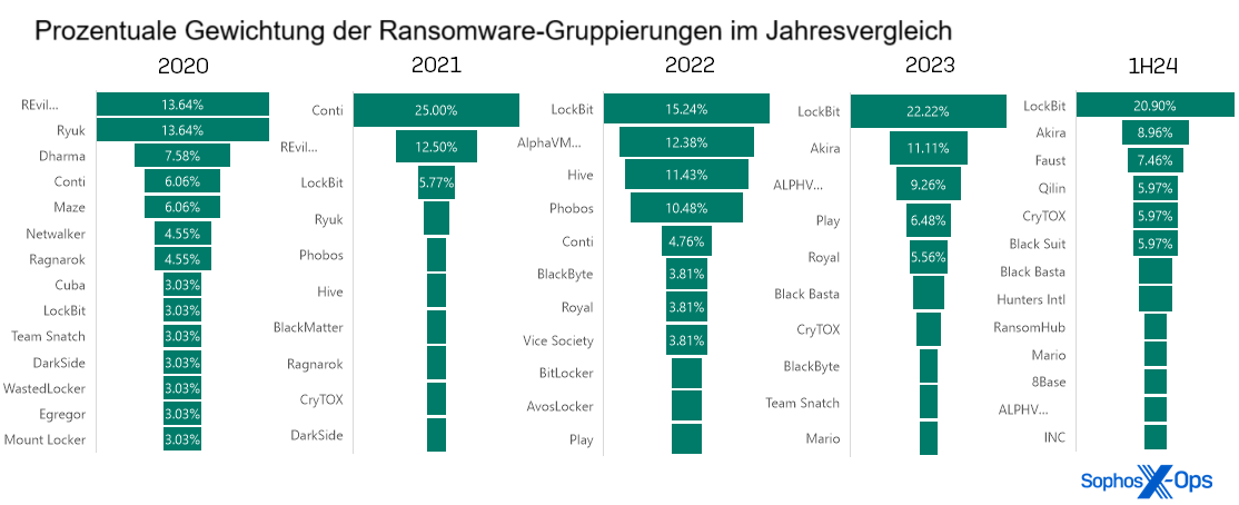 Prozentuale Gewichtung der Ransomware Gruppierungen im Jahresvergleich