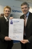 Henner Hussmann, Leiter Datenschutz und Informationssicherheit der TÜV Saarland Gruppe (l.), und Pino v. Kienlin, Geschäftsführer der Sophos GmbH, bei der Übergabe des TÜV Zertifikats am 24.01.2008 in Mainz