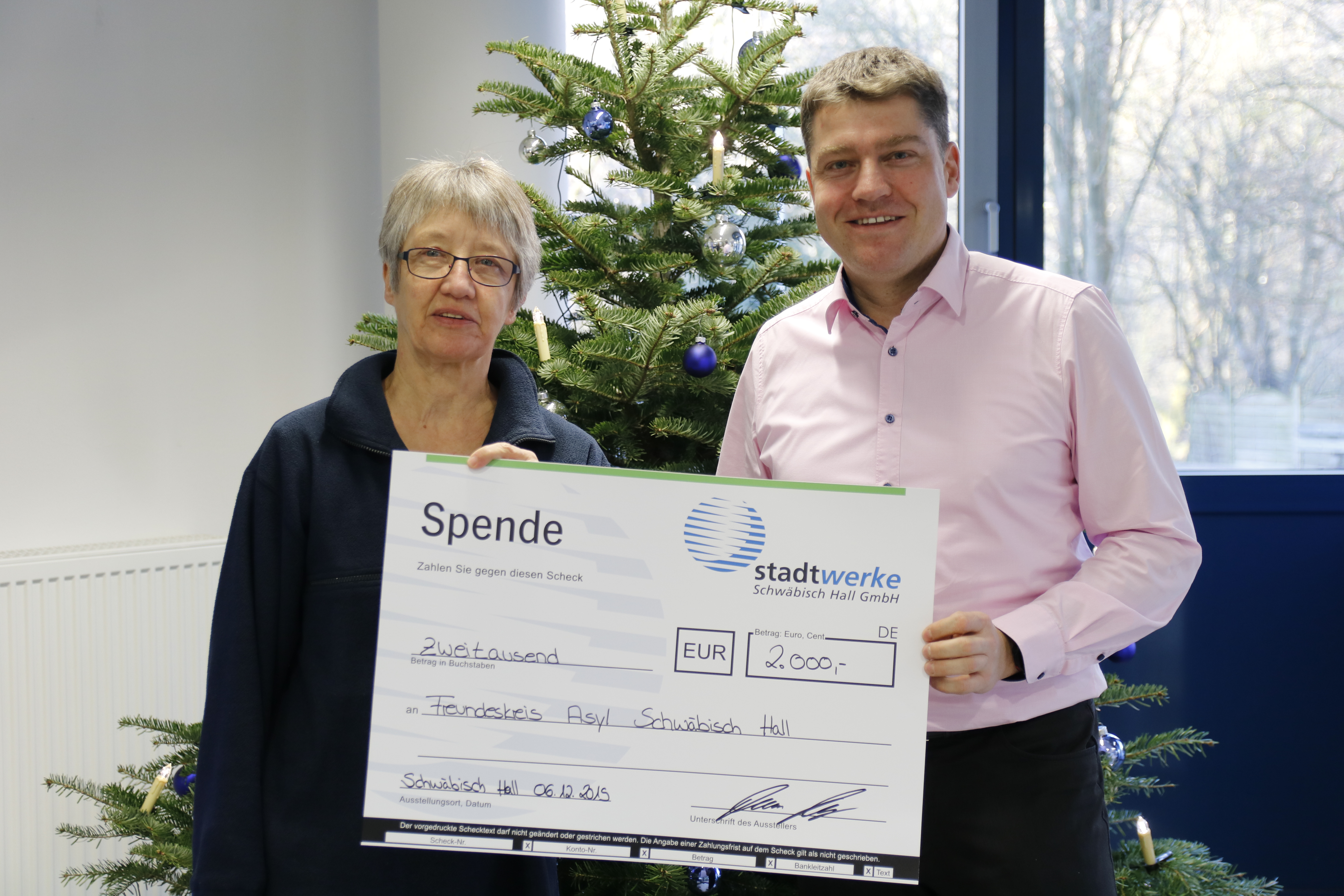 Ein weiteres Drittel der Weihnachtsspende 2019 der Stadtwerke Schwäbisch Hall – ebenfalls 2.000 Euro – hilft dem Verein Freundeskreis Asyl bei der Bezuschussung verschiedenster Dinge wie zum Beispiel die Sprachförderung, Förderung der Ausbildung und des Rechtsbeistandes.