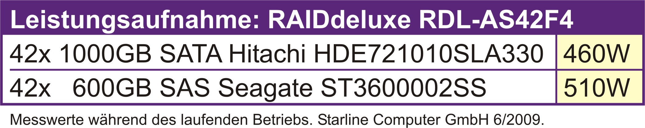 Nicht nur Lizenzkosten spart das RDL-AS42F4 ein – auch der Stromverbrauch fällt deutlich kleiner aus als erwartet. Mit insgesamt nur 460W im laufenden Betrieb, voll bestückt mit 42x 1000GB Festplatten, sind die Verbrauchswerte sogar unter den Werten mancher vergleichbaren 16-fach RAID-Systeme anderer Hersteller.