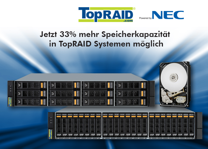 (pressebox) (Kirchheim/Teck, 22.07.2016) Gegenüber den ehemals größten 6 TB HDDs wird somit 33% mehr Kapazität in TopRAID M110 und M310 Systemen erreicht. Zusammen mit den ebenfalls neu qualifizierten 3.84 TB SAS SSDs lassen sich so auch große SSD Caching und Multi-Tiered Lösungen abbilden.