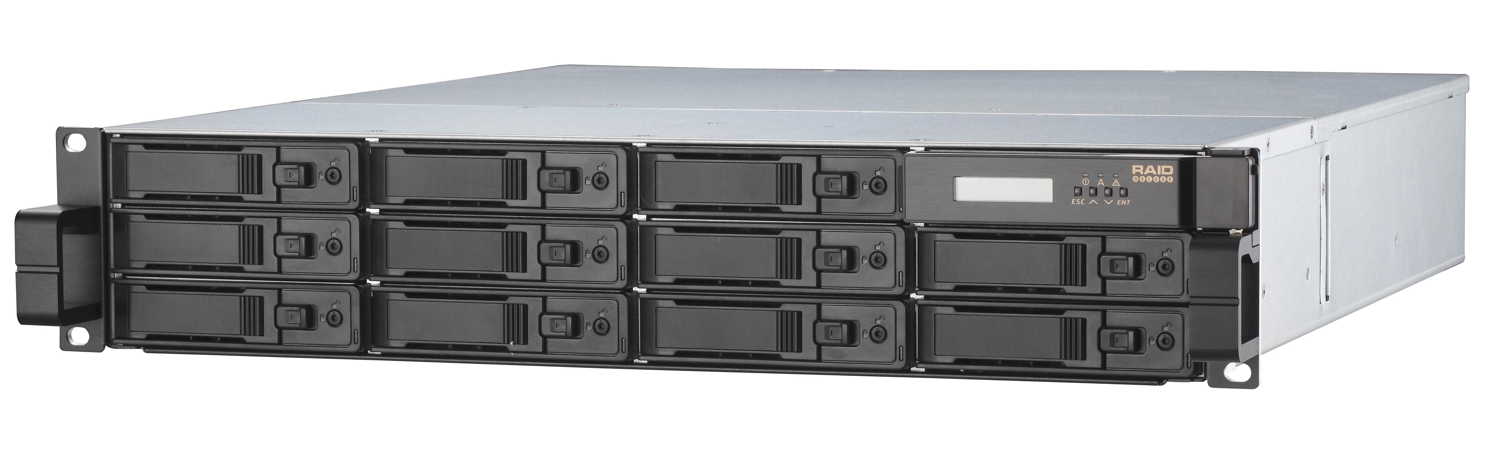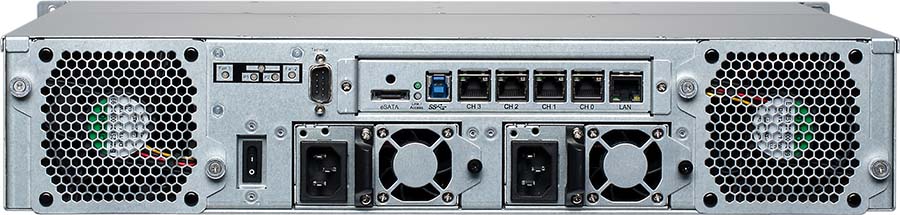 Anschluss findet das zwei Höheneinheiten belegende Rackmount-Gehäuse lokal per USB 3.0 oder eSATA. Im Netzwerk agiert der Festplatten-Verbund mit vier Ethernet-Ports, wobei jeder davon 1 Gbit/s nach iSCSI-Standard liefert.