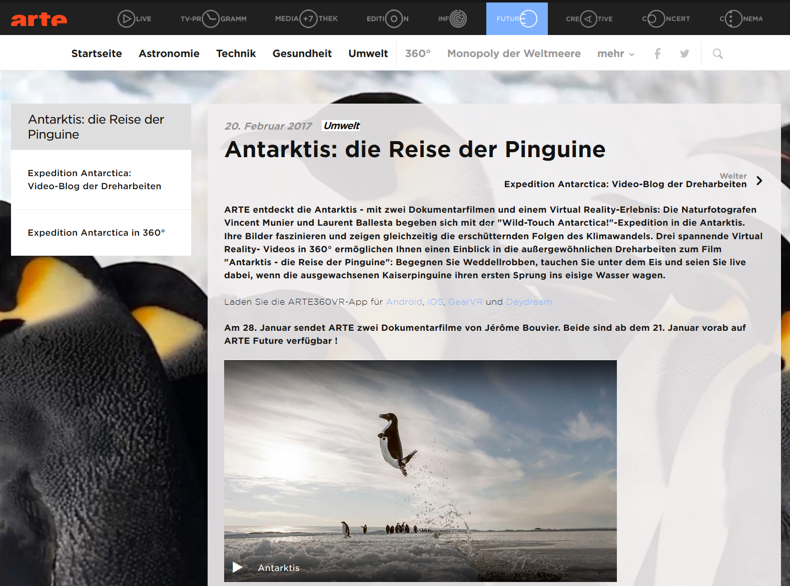 Arte zeigt die Filme in einer separaten Microsite. Dort bekommen Zuschauer auch den direkten Zugriff auf 360-Grad-Filmausschnitte, die sehr anschaulich die Schwierigkeiten bei den Dreharbeiten dokumentieren. Die entsprechende Hardware vorausgesetzt, können sich Interessierte die ARTE360VR-App für Android- und iOS-Systeme, als auch für Google Daydream und Oculus Gear VR herunterladen.